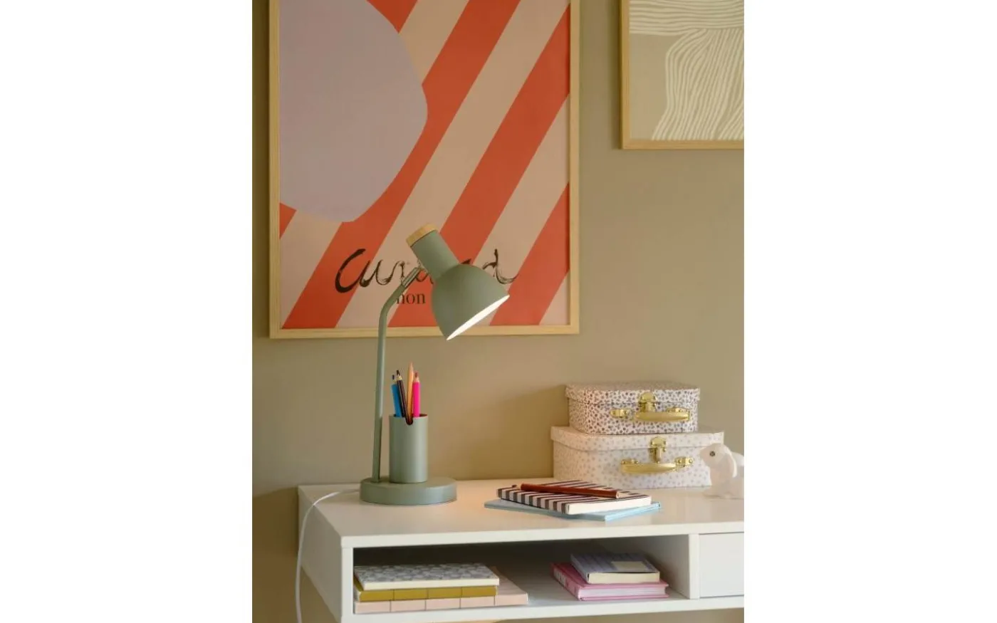 Devone är den perfekta skrivbordslampan för barnrummet med sin fina design, pennförvaring och telefonhållare. Devone är tillverkad i metall med en cool trädetalj högst upp, och den har ett flexibelt lamphuvud som gör den idealisk för att skapa bra läsbelysning.