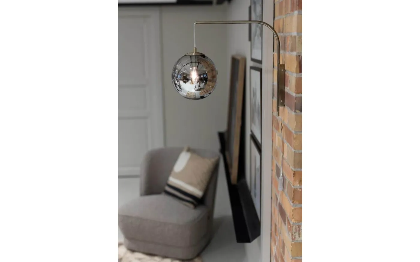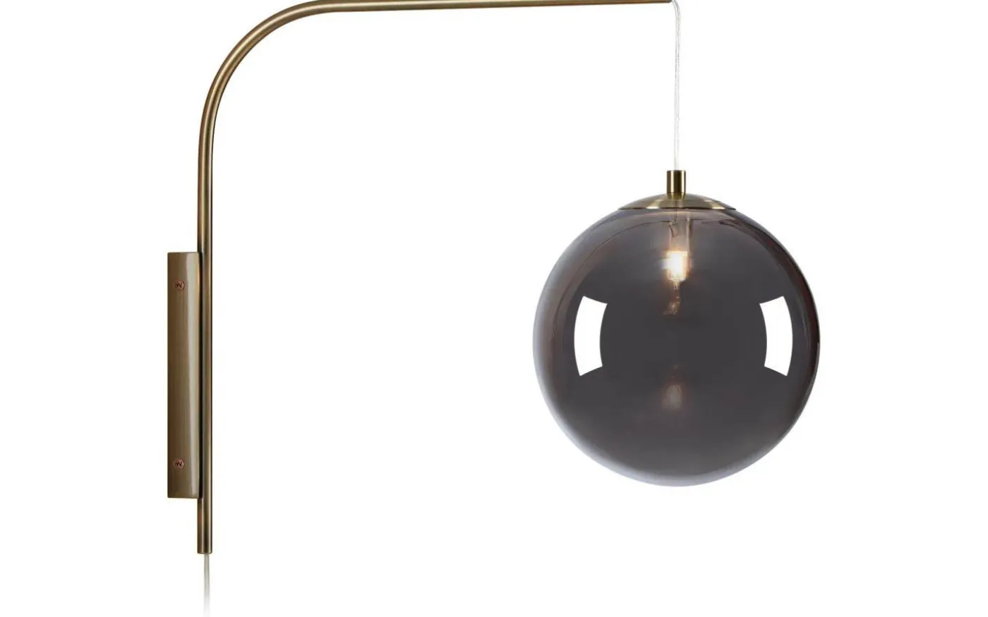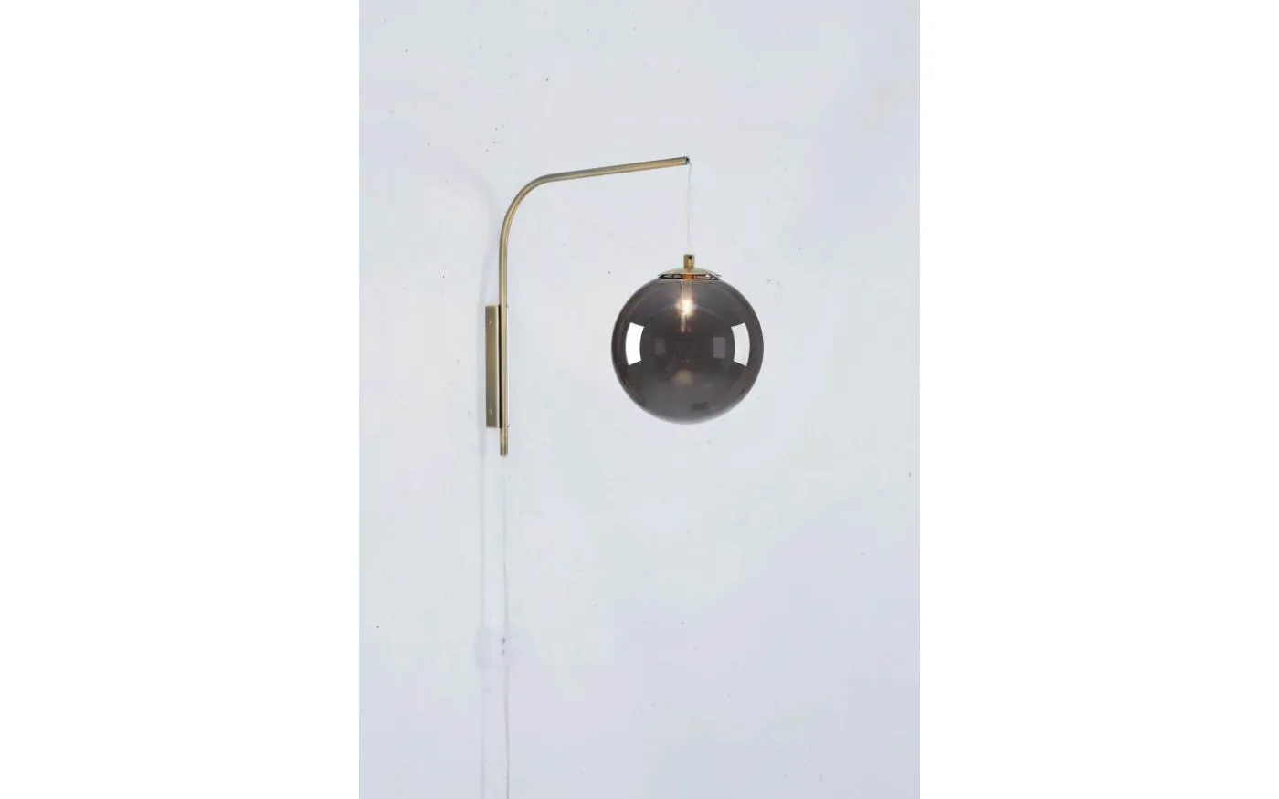Dione vägglampa från Markslöjd ger ett elegant och exklusivt intryck på väggen. Lampbasen och väggfästet är i antikfärgad mässing och från fästet hänger ett rökfärgat lampglas ner ifrån en transparent sladd. Vägglampan gå ut 40cm från väggen.