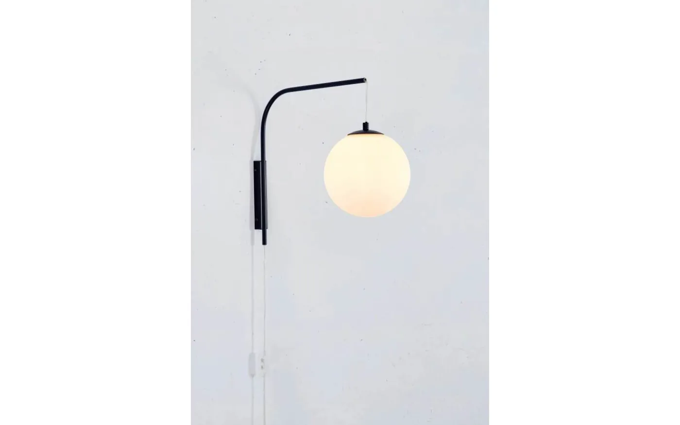 Dione vägglampa från Markslöjd ger ett elegant och exklusivt intryck på väggen. Lampbasen och väggfästet är i mattsvart metall och från fästet hänger ett opalt, vitt lampglas ner ifrån en transparent sladd. Vägglampan gå ut 40cm från väggen.