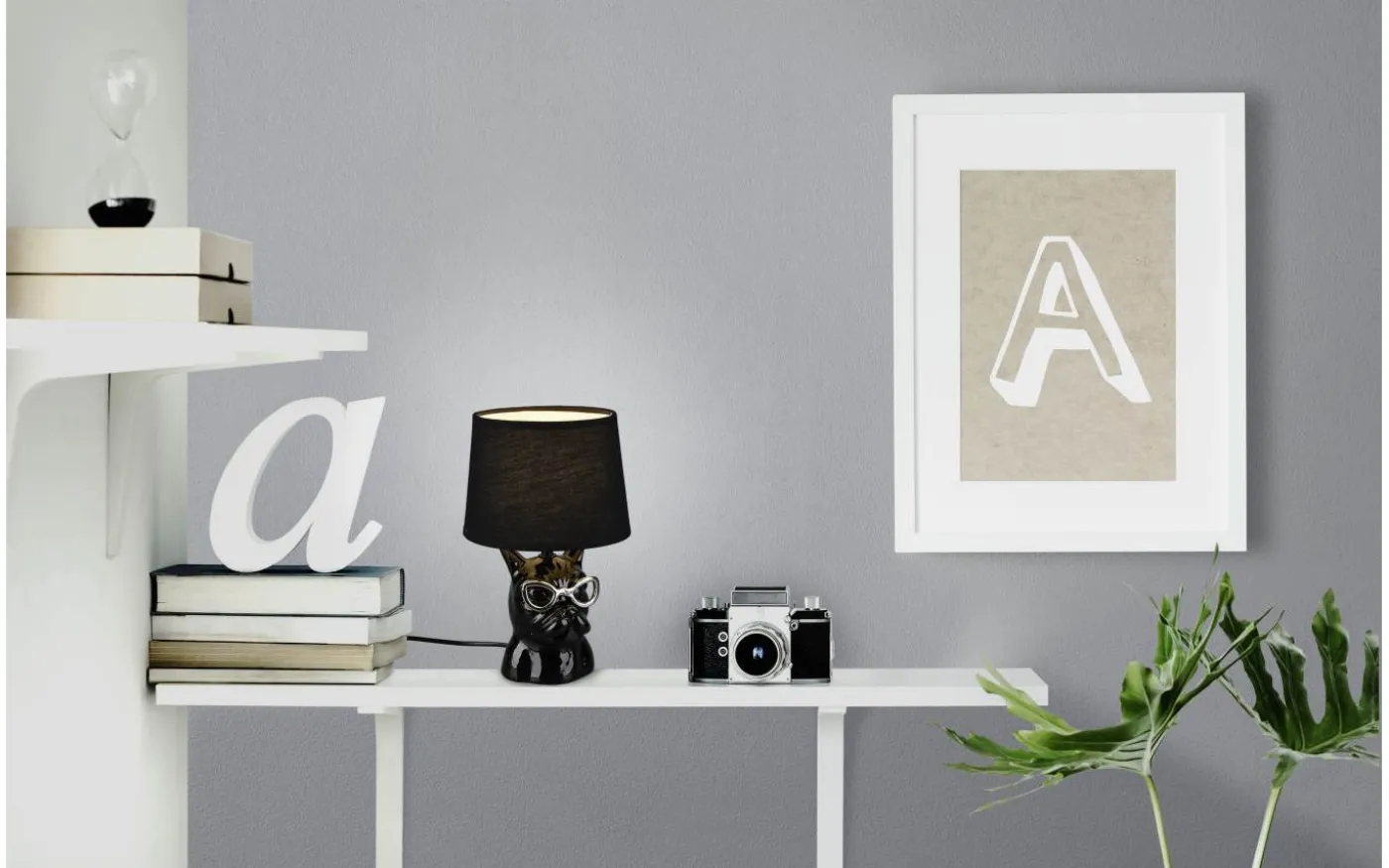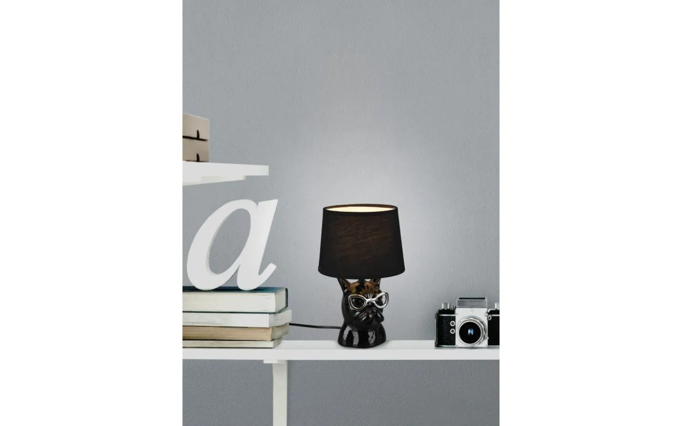DOSY-serien låter dig sätta accenter. Bordslamporna med sitt ovanliga utseende är också riktiga höjdpunkter när de är släckta. Textilskärmen är monterad på en keramisk bas i form av ett hundhuvud. Den förtrollande bordslampan kan användas i tonårsrummet, sovrummet eller vardagsrummet. Lampans form kommer att glädja både unga och gamla. Lampan har en höjd på 29 cm och en diameter på 18 cm. Lampan är också utrustad med en sladdströmbrytare, vilket gör den enkel att tända och släcka. Keramisk bas och textilskärm är designade i en enhetlig svart färg och är ett riktigt blickfång i kombination med den kromfärgade ramen. För energibesparande belysning rekommenderas att använda en LED-lampa. Dessa är ett optimalt alternativ till konventionella halogenlampor och står för hög ljuskvalitet och energibesparingar på upp till 80 %. Dessutom hjälper LED-lampor dig att dra nytta av lång livslängd, låg värmeutveckling och samtidigt skydda miljön. Ljuskälla: exklusiv 1x E14 · max. 40W. Extra information: Kabelbrytare, IP20, Lampa(or) ingår ej
