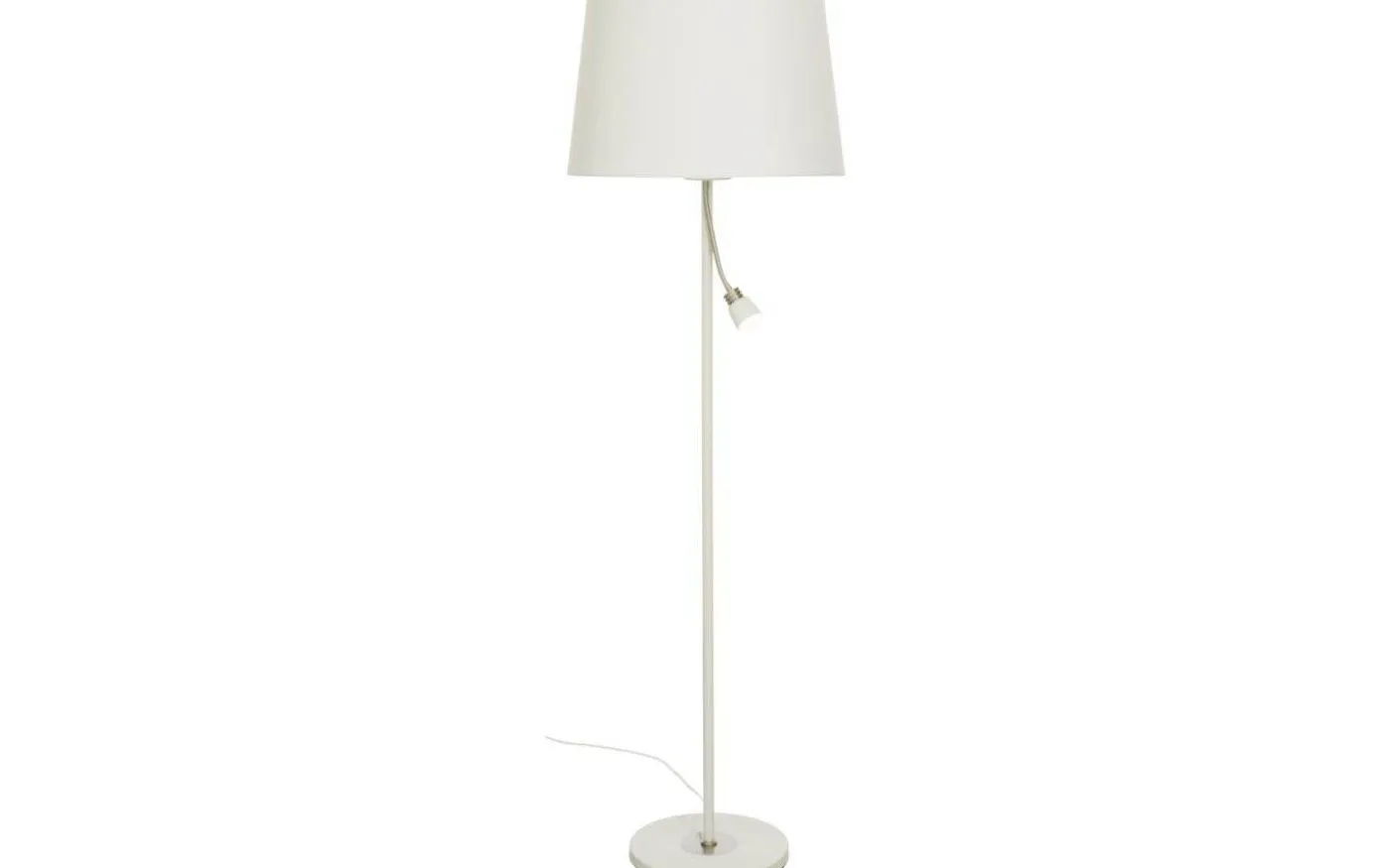 Eketorp golvlampa i vitlackerad metall med detaljer i stål och vit textilskärm. Justerbar arm med integrerad 5W LED som ger behagligt varmt vitt ljus. Max 60W E27 för textilskärmen, ingår ej. Separata strömbrytare på lampan.
