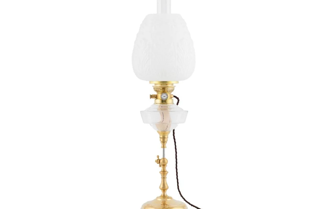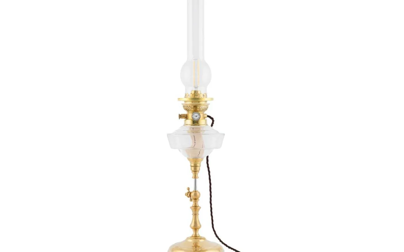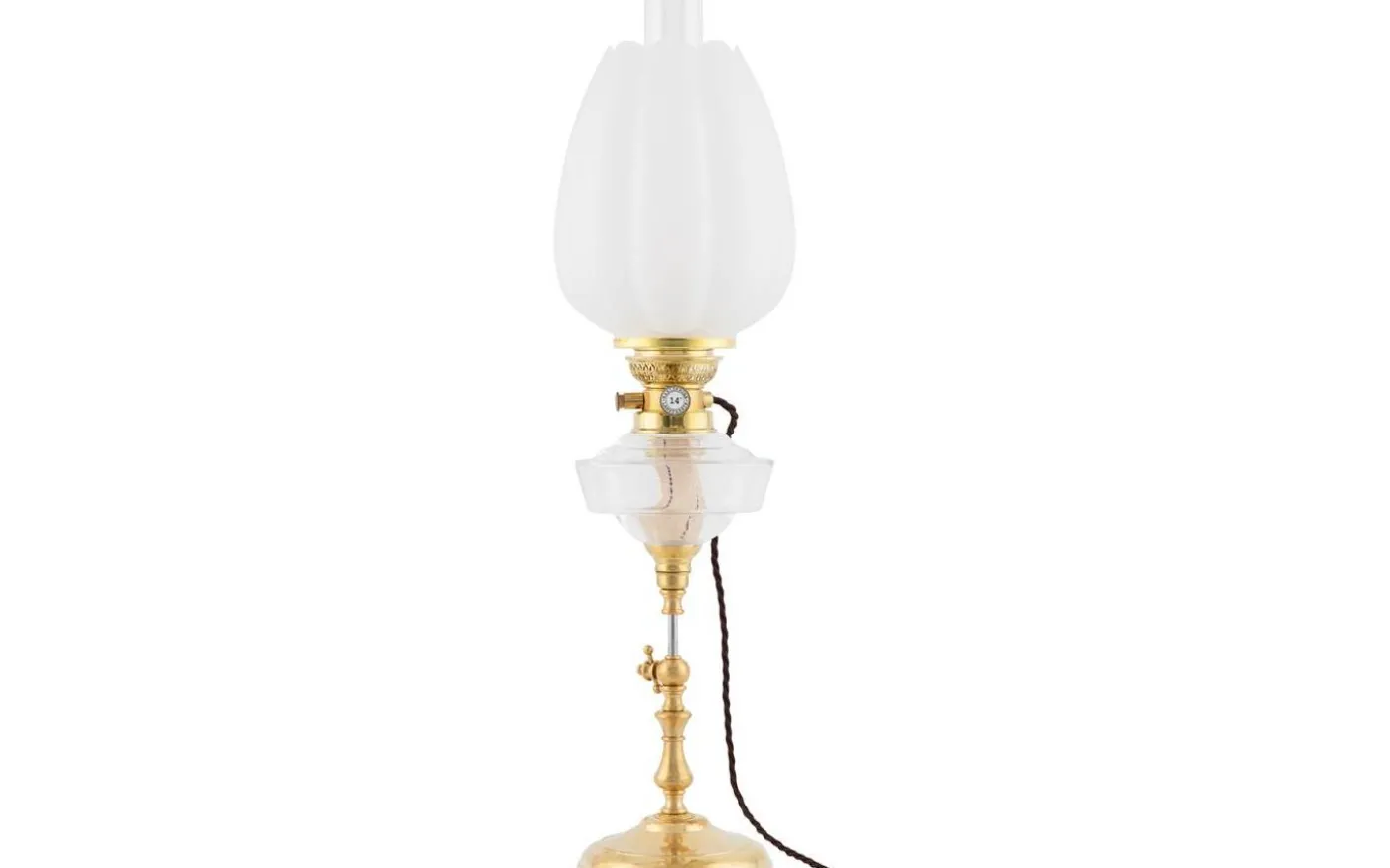 En magnifik elmonterad fotogenlampa på ställbar fot som verkligen fyller sin plats. Har i sitt originalutförande funnits i vårt sortiment sedan 1890-talet. Höjden på fotens metallstag går att reglera från 0 till 10 cm.