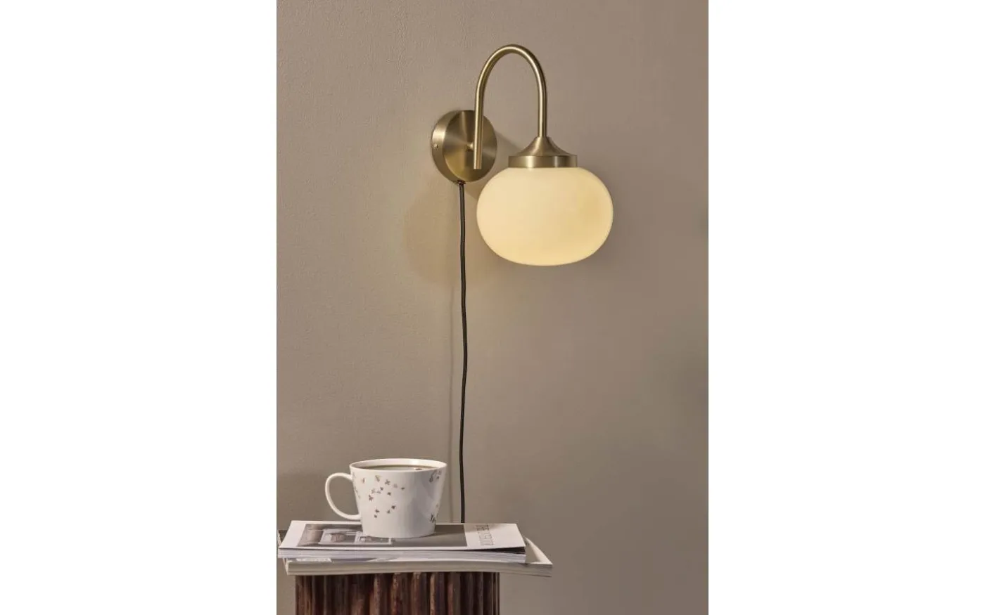 Vägglampans stomme av metall är mässingspläterad och de den vackra glaskupan är krämfärgad och avger ett varmt och ombonat ljussken.
