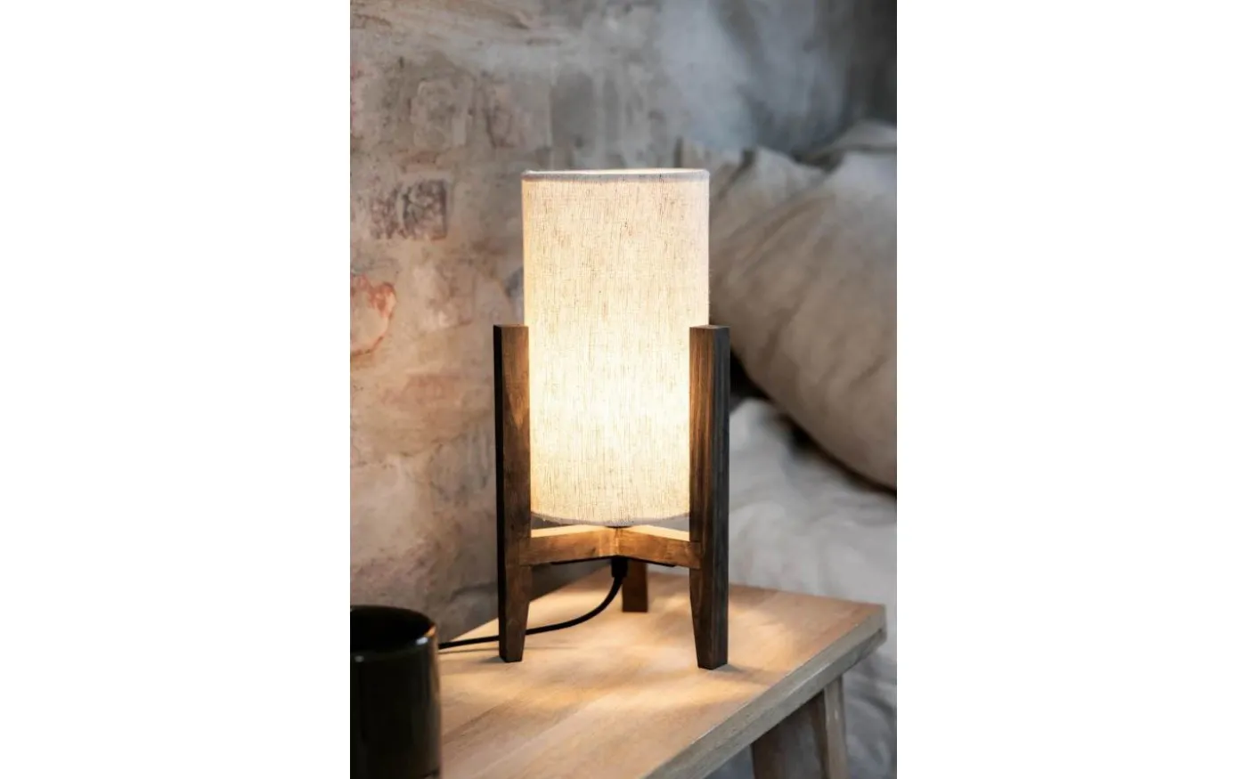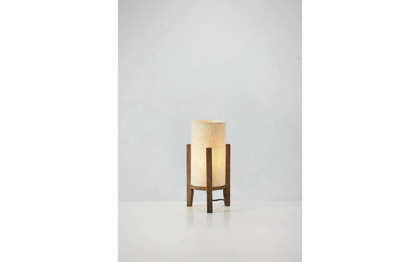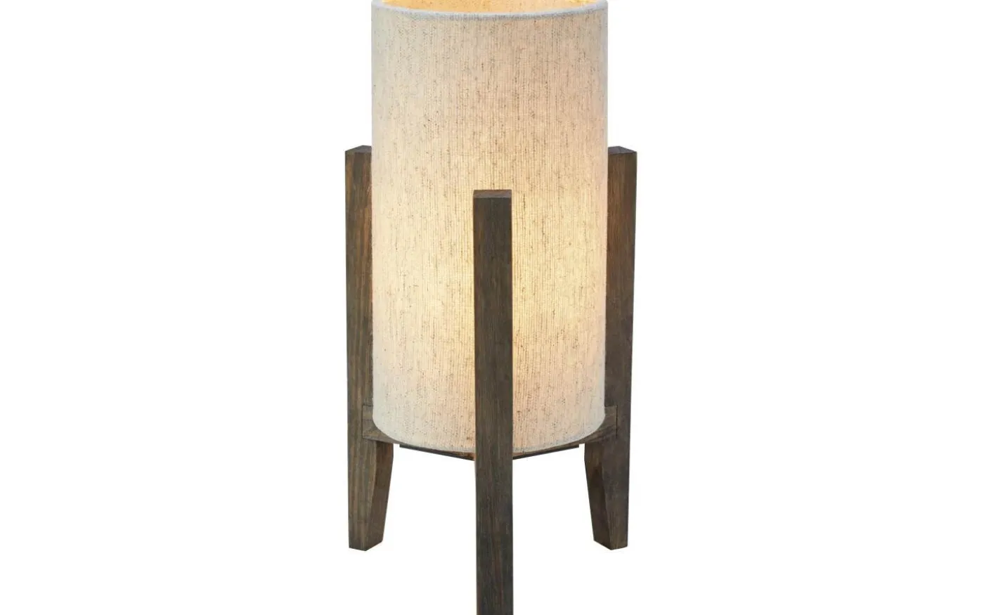 Bordslampa som kombinerar materialval från en varm och rustik stil med enkel skandinavisk formgivning. Cylinderformad textilskärm med beige linnestruktur som släpper igenom ett behagligt stämningsljus. Lampfot i brunbetsad trä som påminner om valnöt. Gör sig fin som stämningsbelysning på t.ex. en skänk, byrå eller i ett fönster. Totalhöjd om 34cm och diameter om 18cm. Finns även i större variant.
