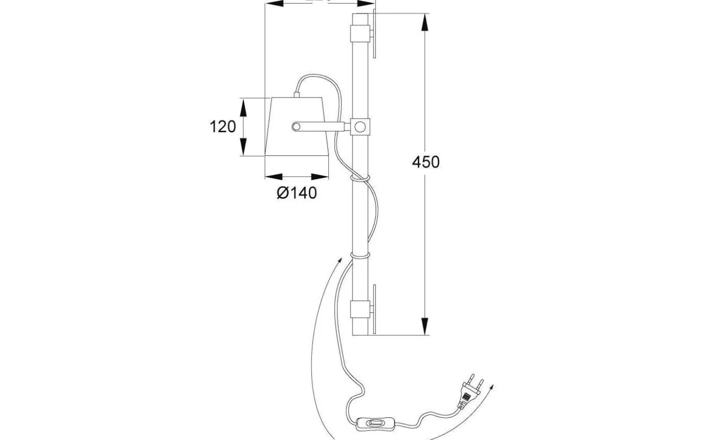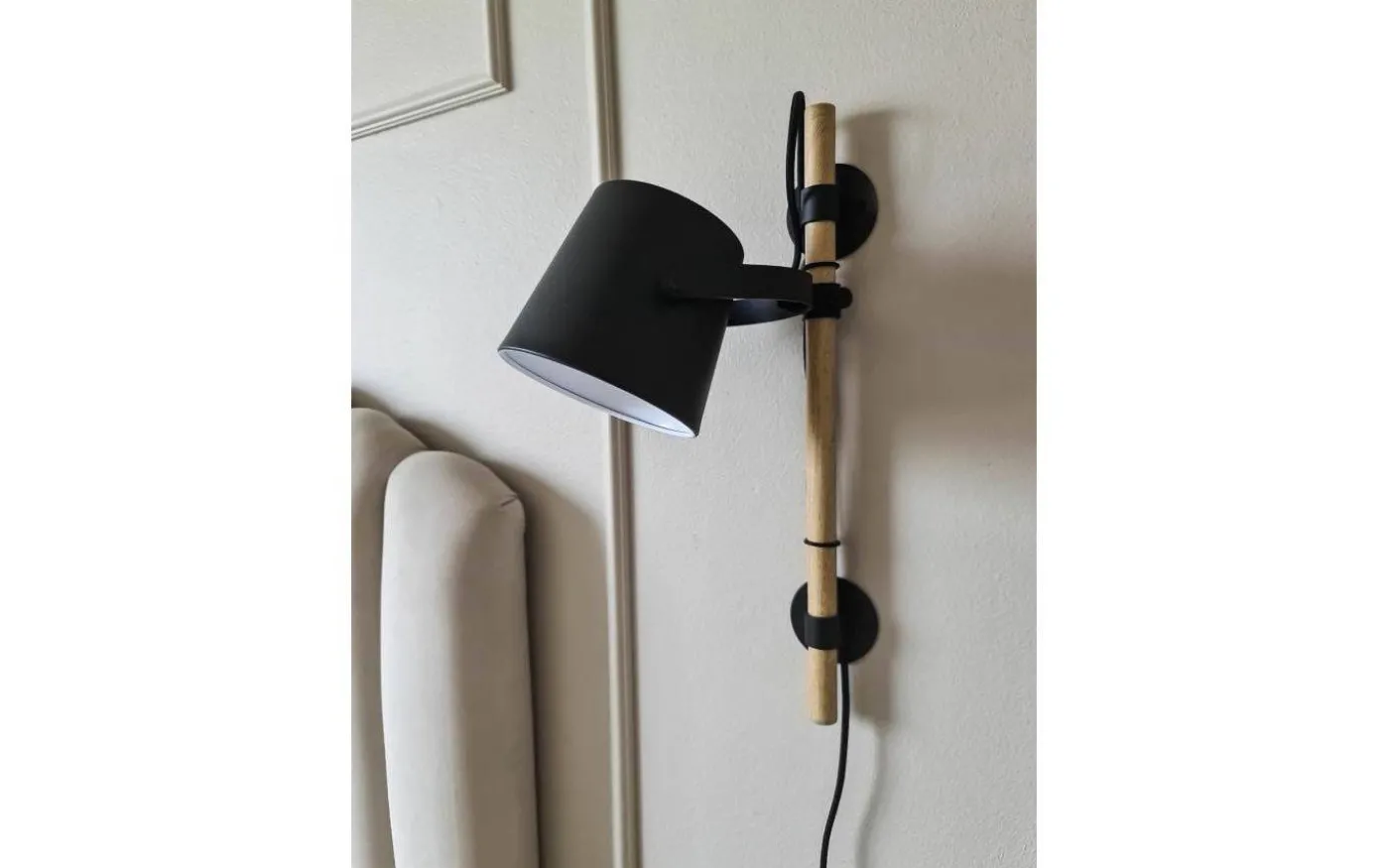 Espresso vägglampa i metall svart och träfärgad. Passar lika fint som läslampa i vardagsrummet eller som sänglampa. Skärmen är riktbar.
