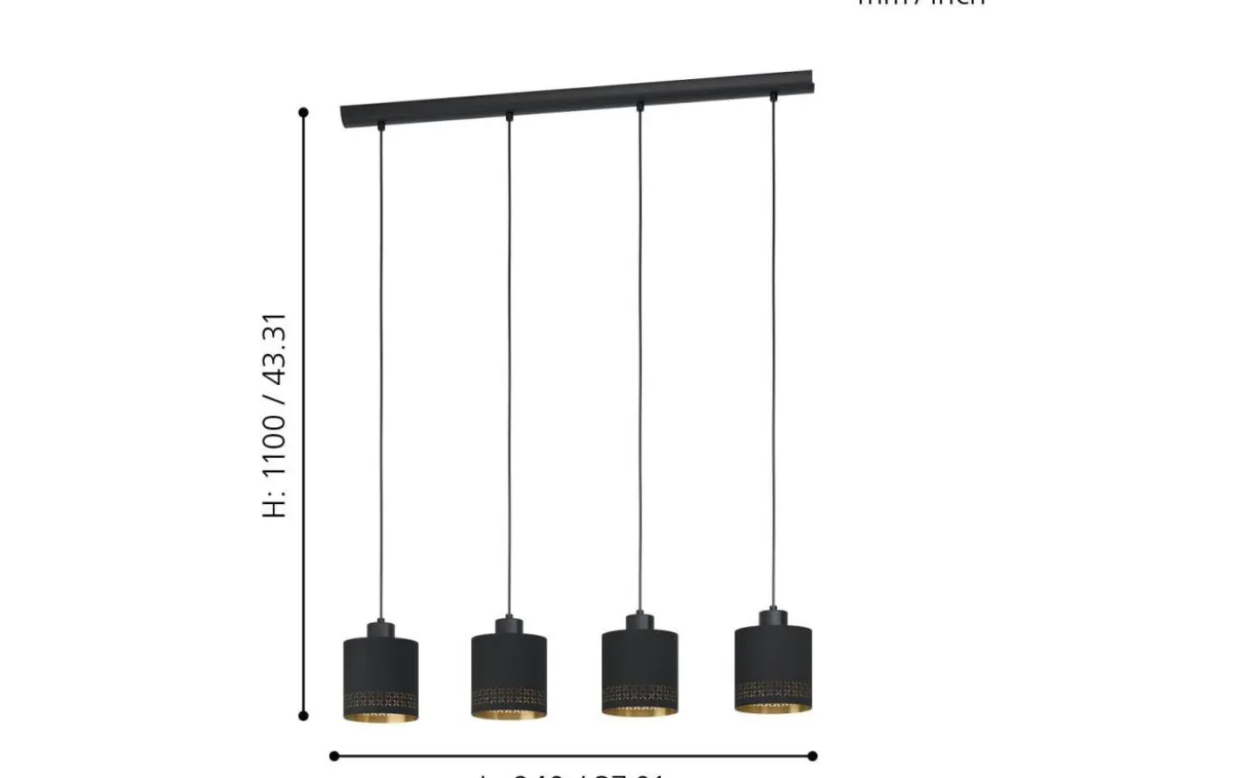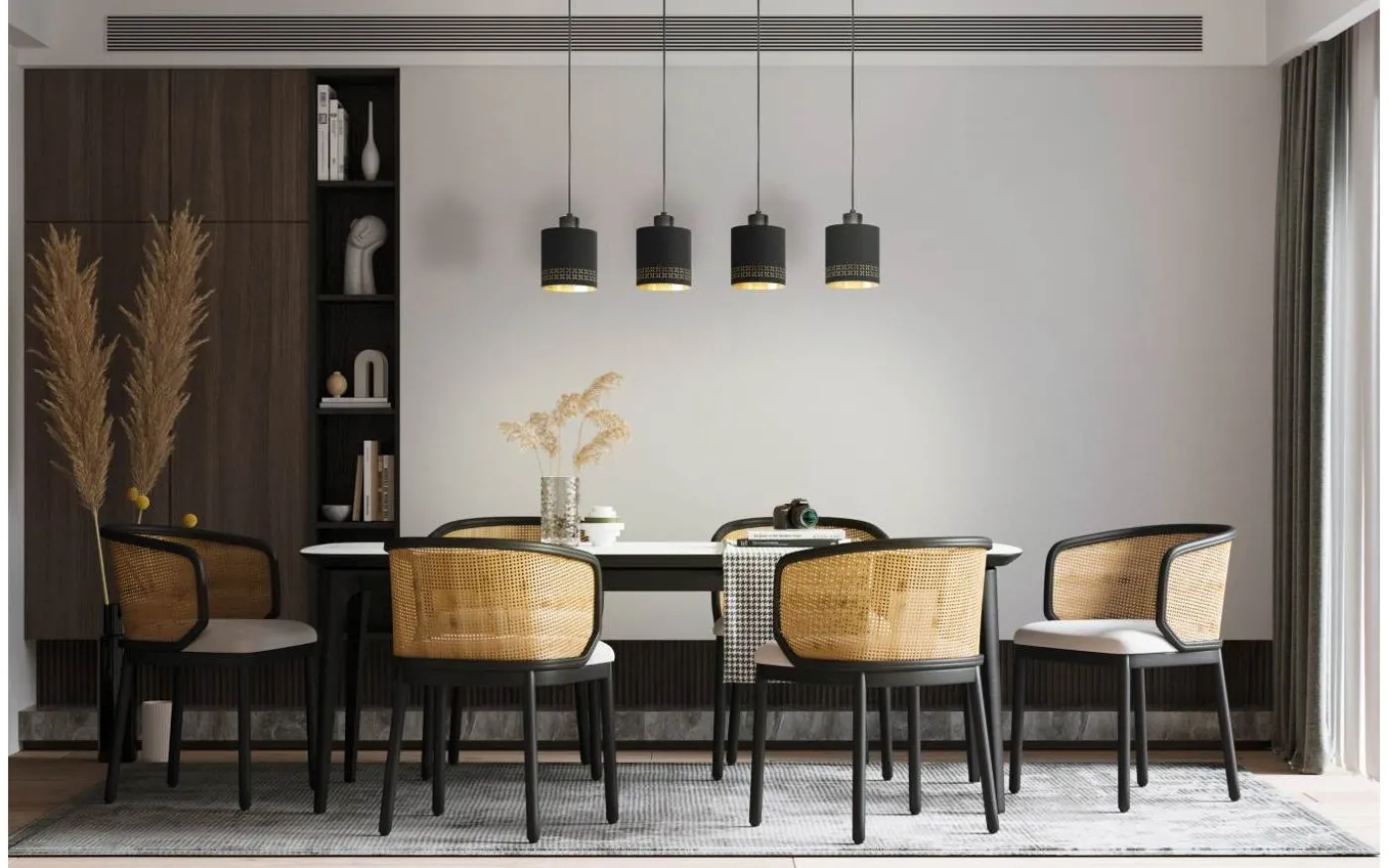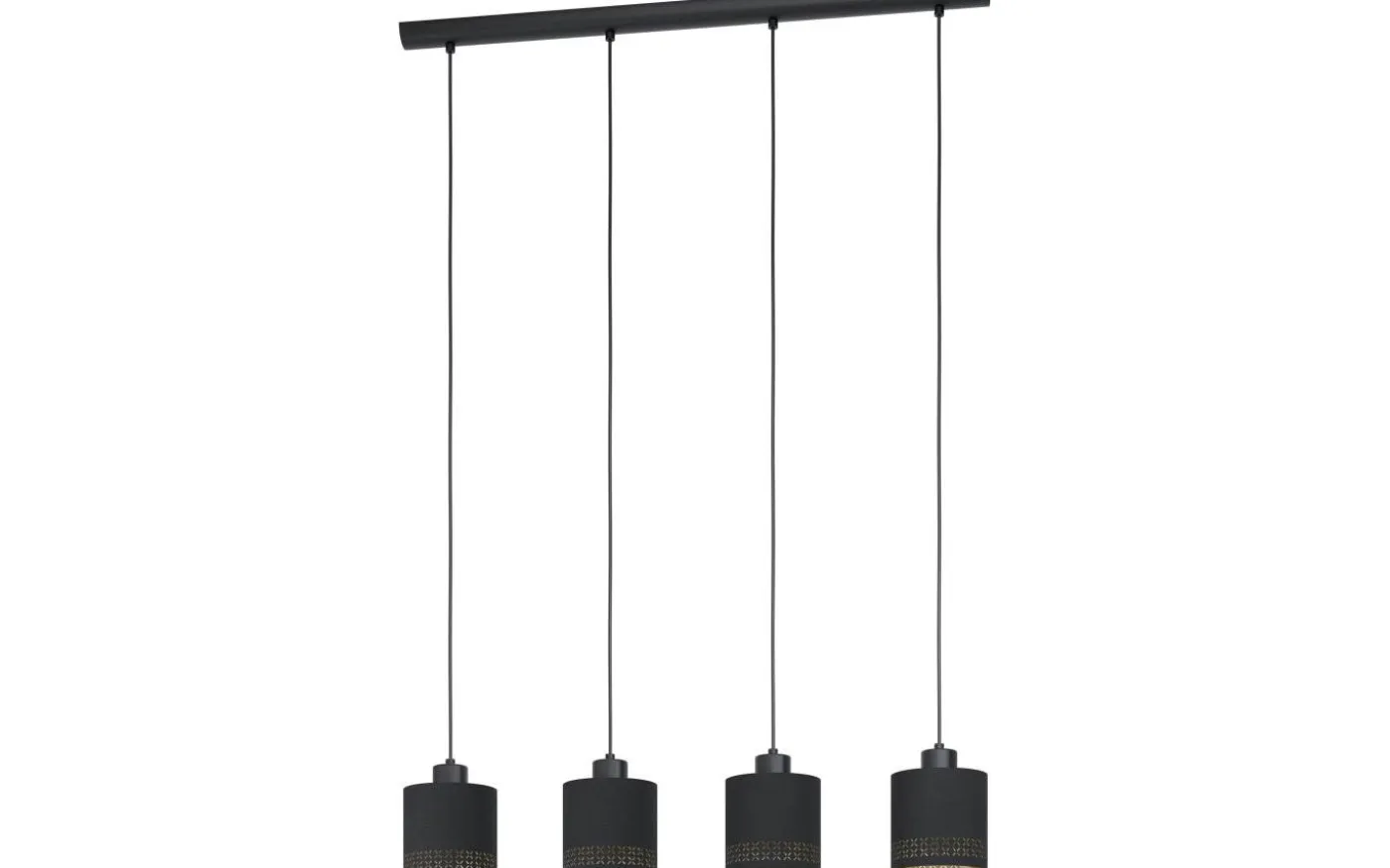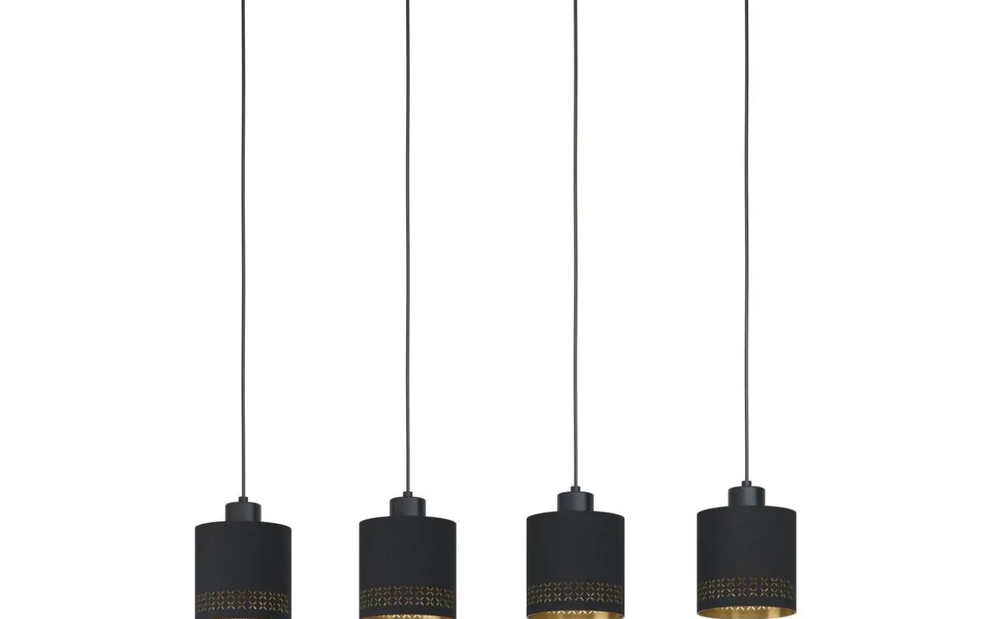 ESTEPERRA taklampa är gjord av svart metall och har fyra runda lampskärmar av svart tyg med inre guldfoder. De små utskärningarna runt lampskärmarnas kanter skapar ett fascinerande spel av ljus och skugga så fort ljuset tänds. Pendellampan smälter in i nästan vilken heminredning som helst och ger stilfull belysning för alla utrymmen, oavsett om det är i vardagsrummet eller över ett långbord i matsalen.