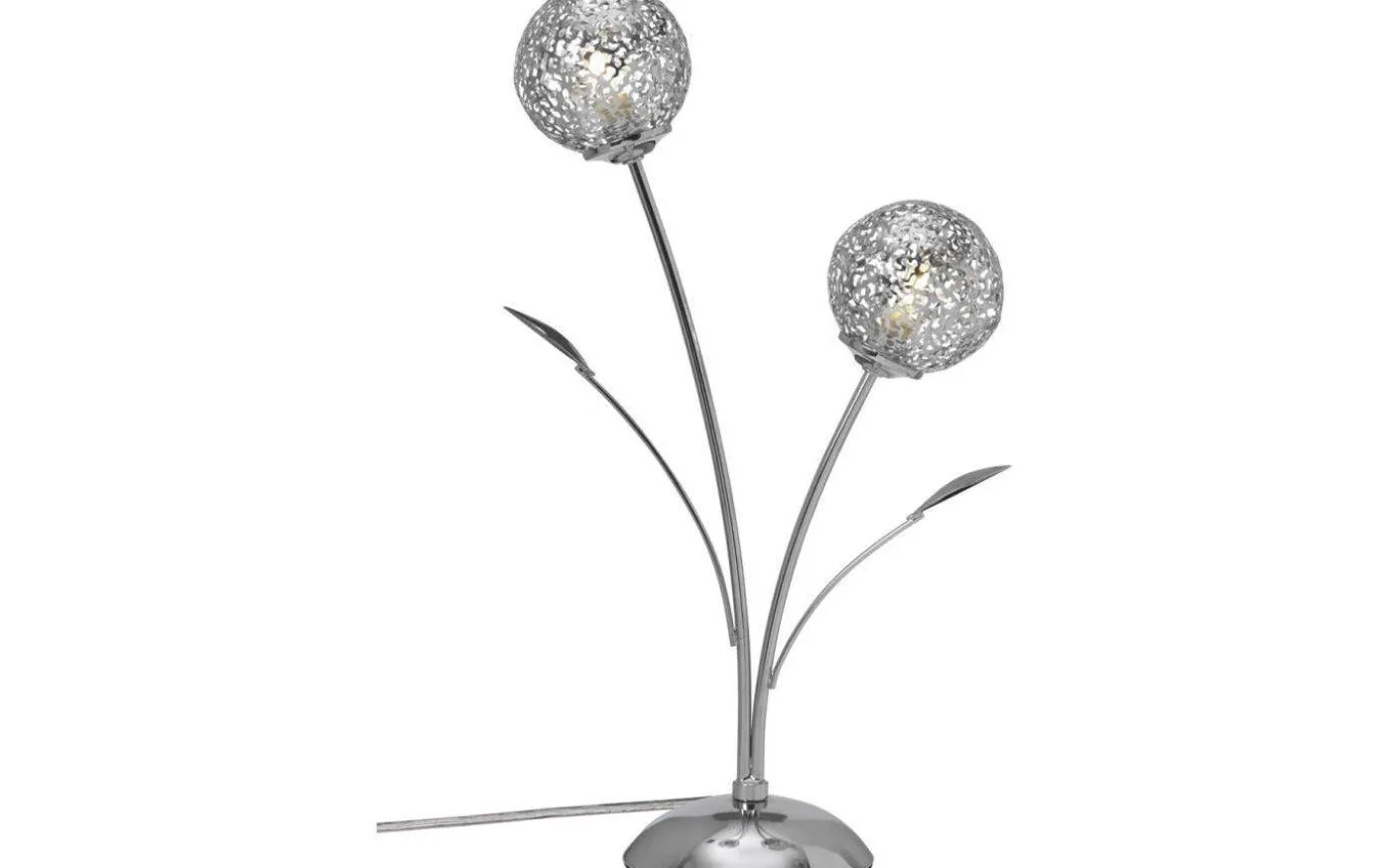 Etsy bordslampa från Cottex är en elegant bordslampa likt en blomma. Etsy är tillverkad av metall med kromad finish. Bordslampan har två glober med utstansat mönster som ger en härlig ljusspridning och dekorativa blad,