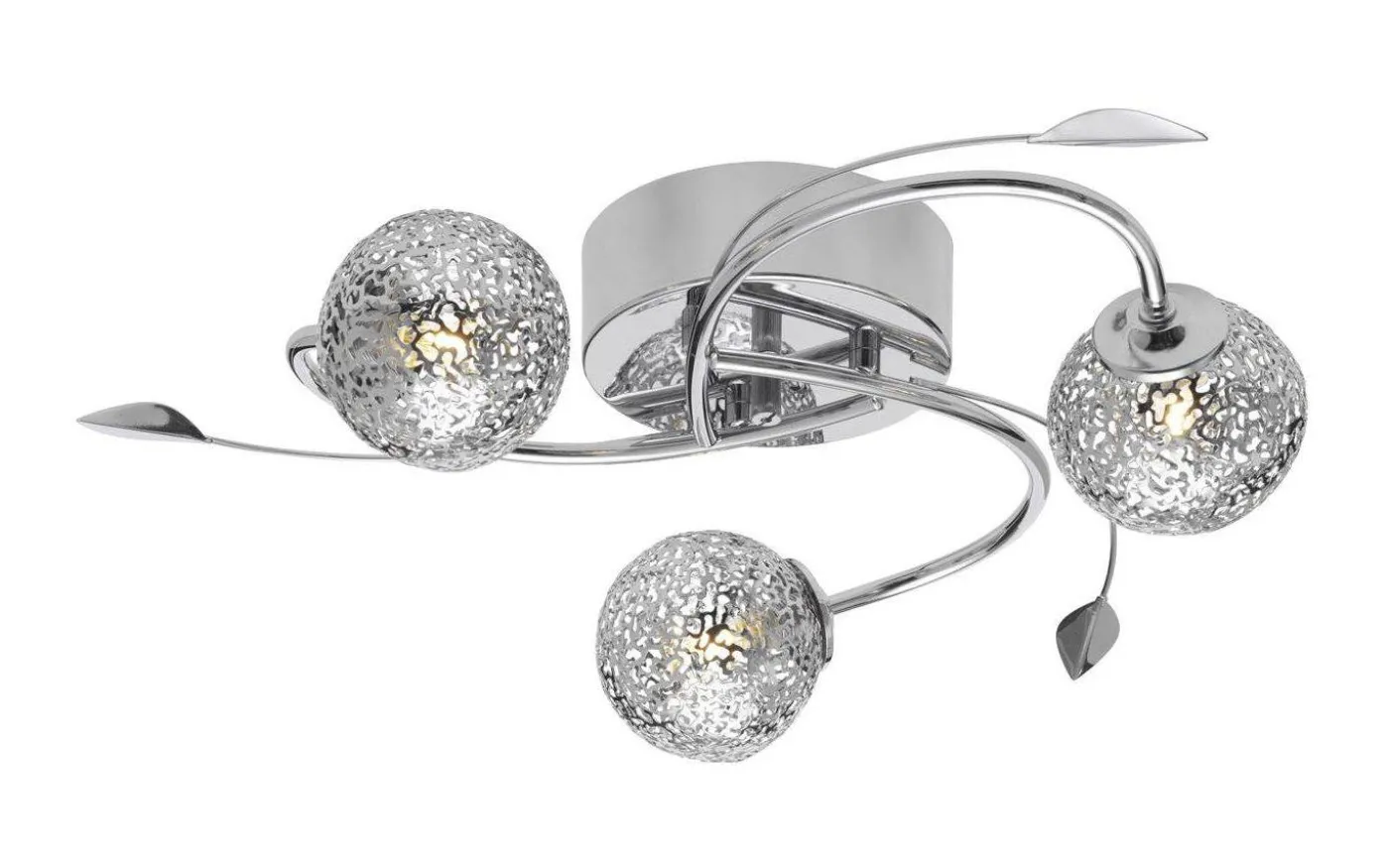 Etsy plafond från Cottex är en elegant plafond tillverkad av metall med kromad finish. Plafonden har tre glober med utstansat mönster som ger en härlig ljusspridning och dekorativa blad längst sidorna.