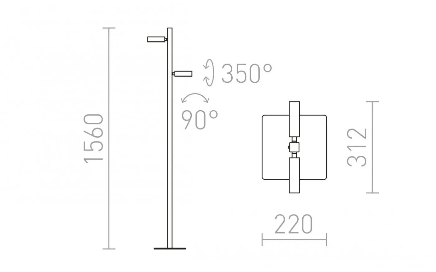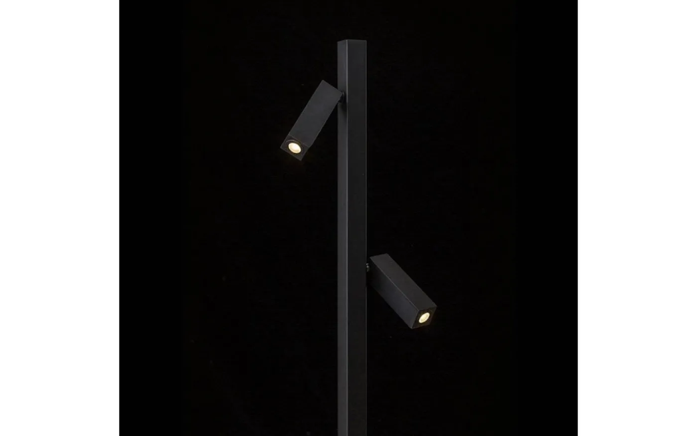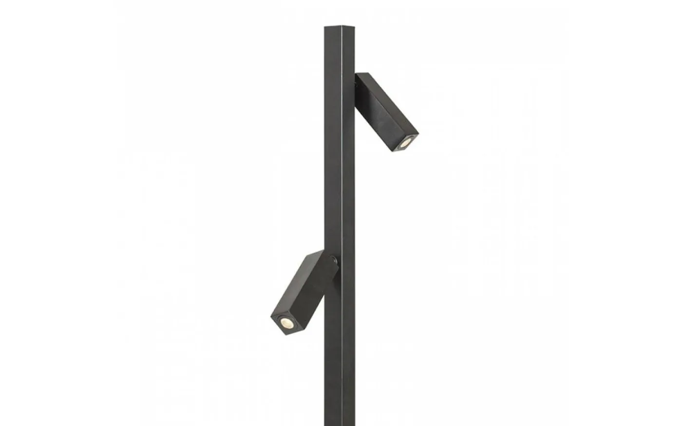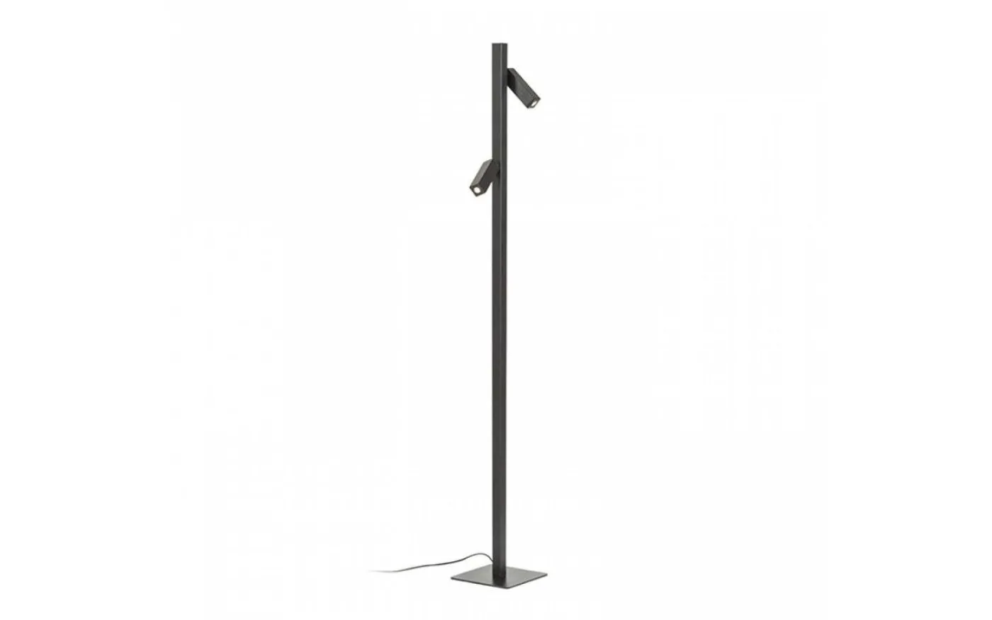 Golvlampa i kantig design med två riktbara LED ljuskällor.