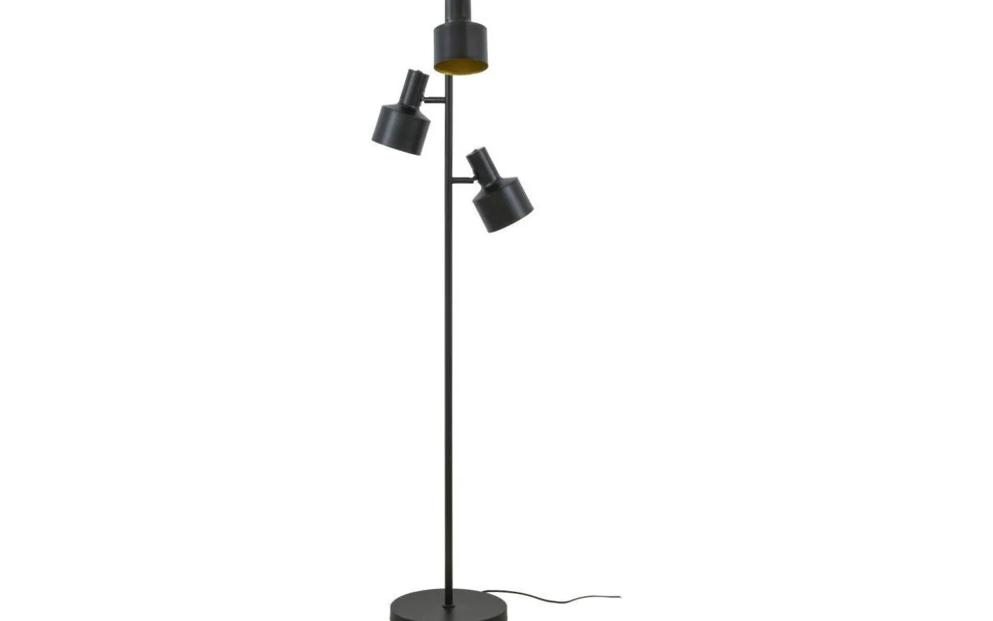 Ferdinand golvlampa från välkända Aneta har tre retroinspirerade skärmar i svartlackerad metall med guldig insida som ger ett varmt ljussken. Lamporna tänds och släcks med separata strömbrytare som är placerade uppe på varje lamphuvud.