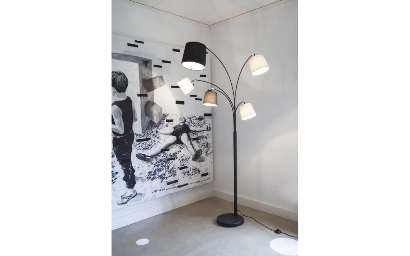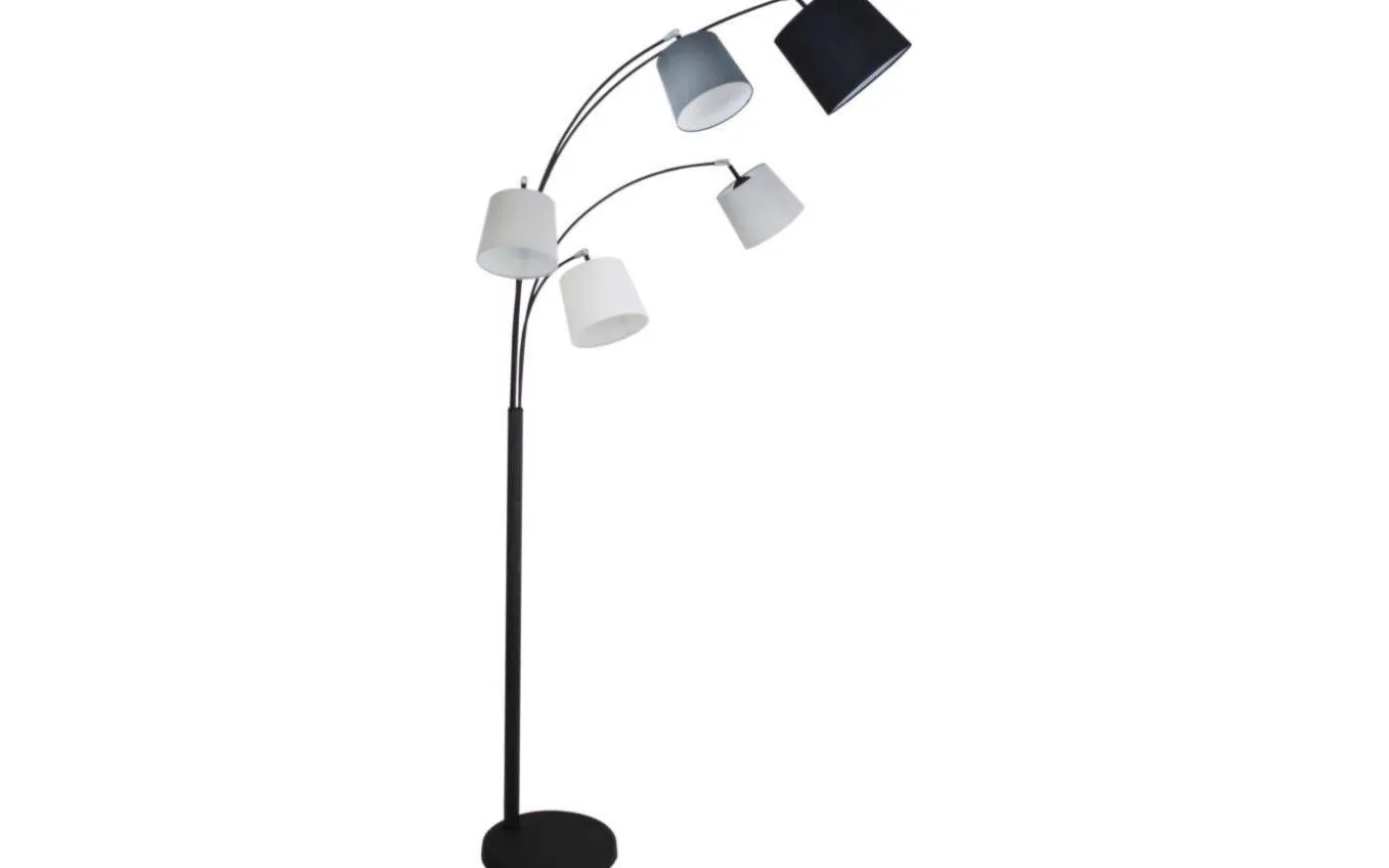 Foggy golvlampa från By Rydens har fem armar i olika längder med skärmar i olika mått som skapar en riktigt kul design och blir verkligen dekorativ vid en soffa eller favoritfåtölj. Skärmarna går i tonerna grå, svart och vit.