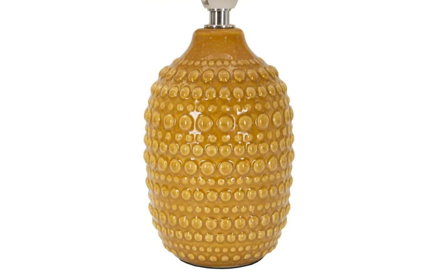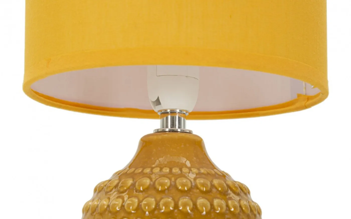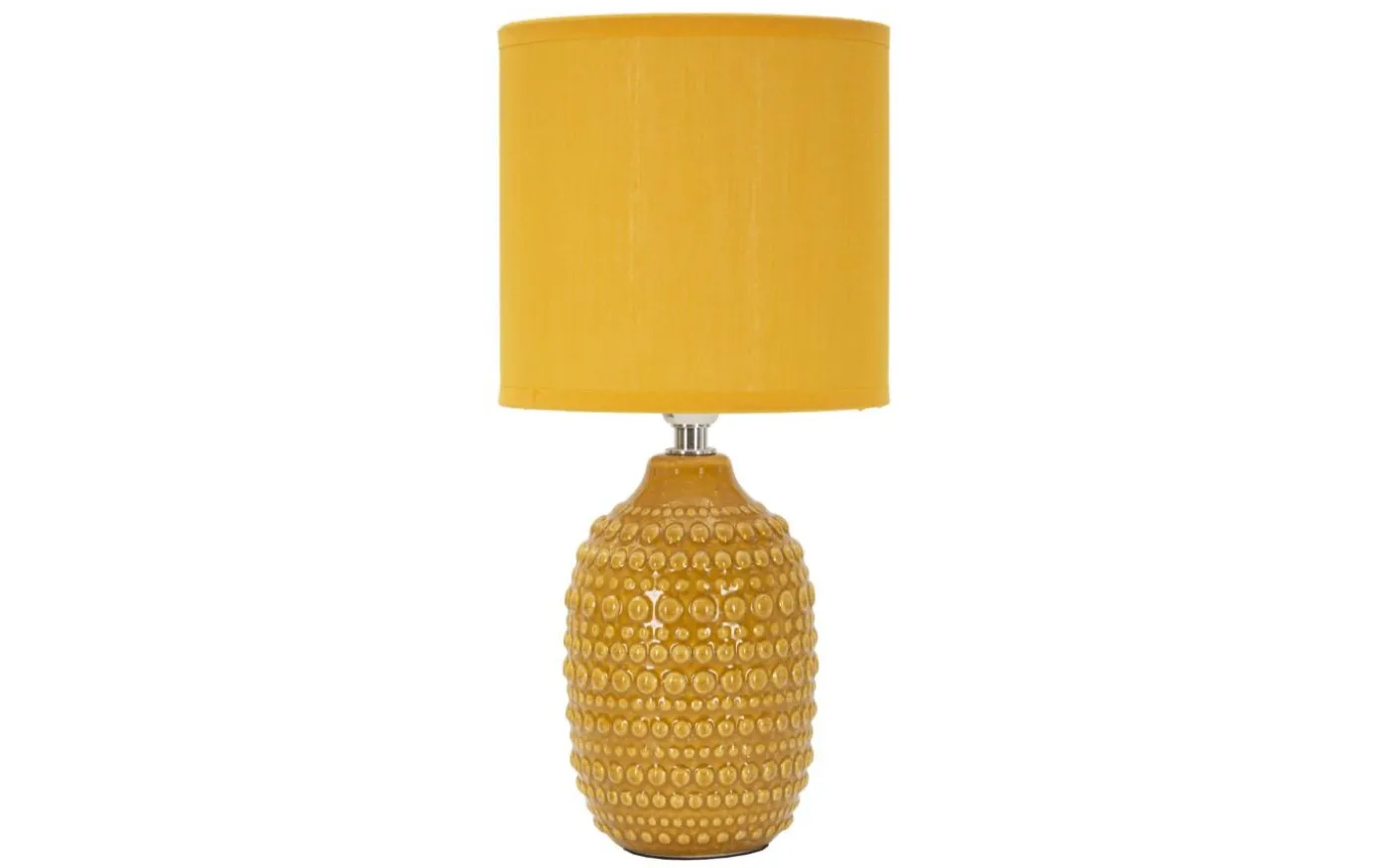 Sänglampa med ockra sockel och reliefdekorationer, perfekt för en touch av elegans och modern stil i sovrummet. Komplett med skärm i ockra tyg.