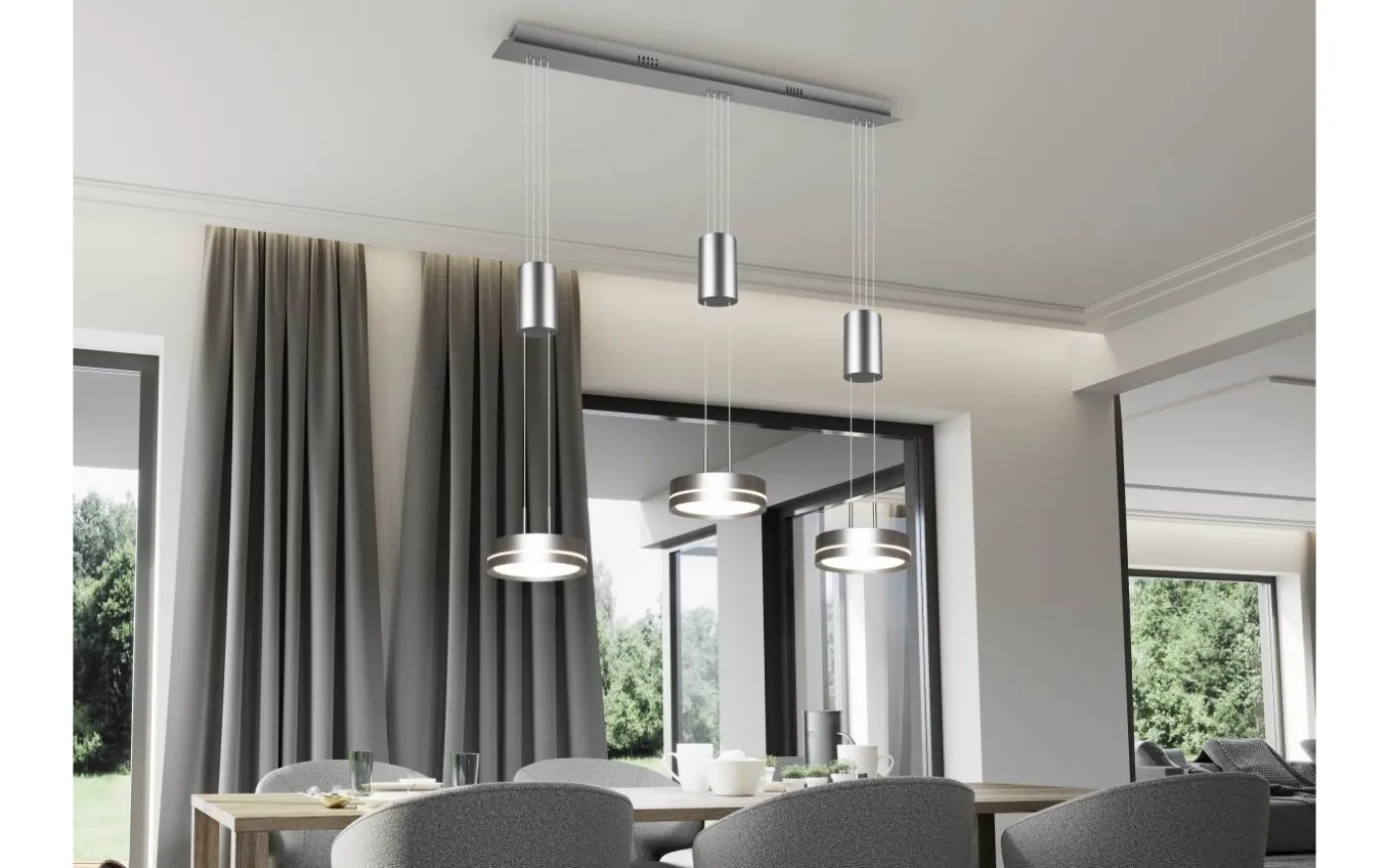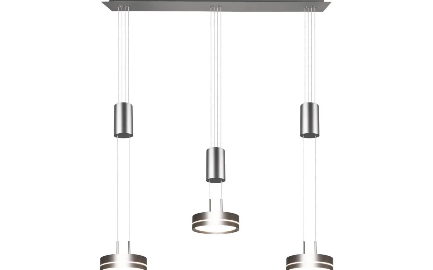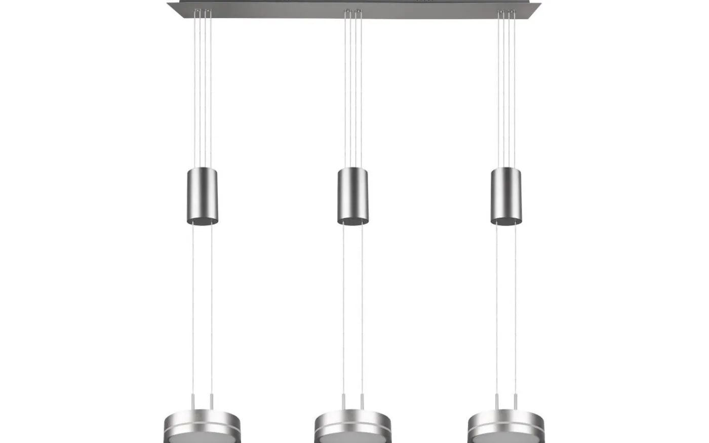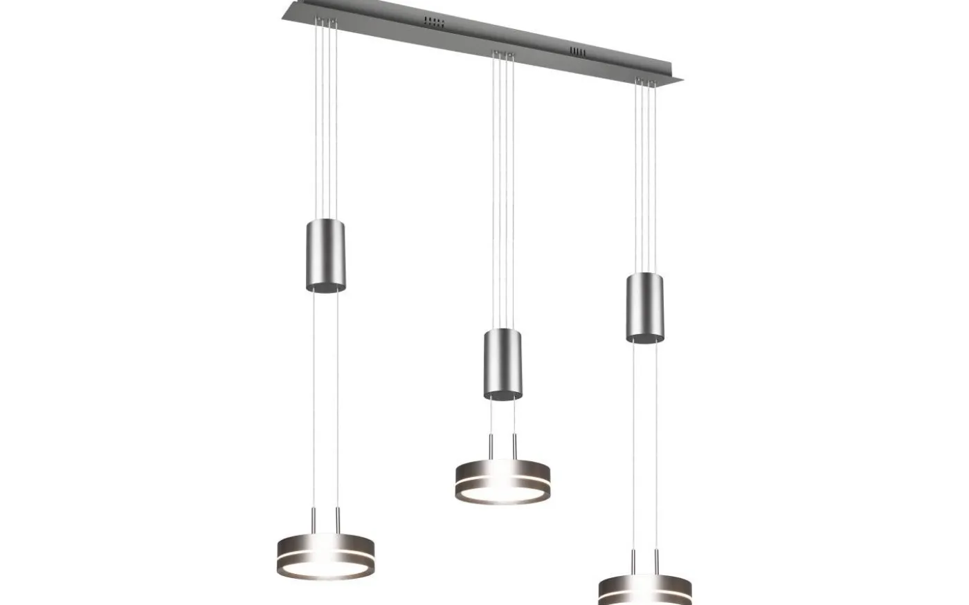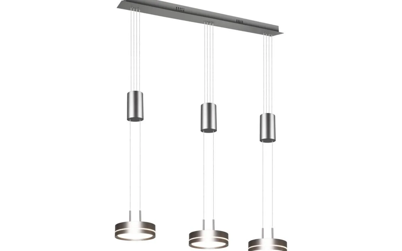 Praktisk, funktionell och snygg! FRANKLIN-armaturen imponerar med sitt moderna, futuristiska utseende. Dessutom kan de individuella ljuskällorna enkelt justeras i höjd, vilket gör lampan idealisk för vardagsrummet. Hängd över ett avlångt matbord eller köksbänk kommer pendellampan till sin rätt. Den integrerade SWITCH-dimmern möjliggör olika ljusstyrkenivåer och ger lämpliga ljusstämningar. Tack vare färgdesignen i matt nickel sätter lampan eleganta accenter och kan kombineras med befintliga möbler. Dessutom använder armaturerna modern LED-teknik, vilket står för hög ljuskvalitet. LED-ljuskällor kännetecknas av lång livslängd och låg värmeutveckling. Ljuskälla: inklusive 3x SMD LED, 9W · 3x 1050lm, 3000K. Extra information: Justerbar höjd, Takmontering, IP20, Ej lämplig för extern dimmer, Dimbar via strömbrytare