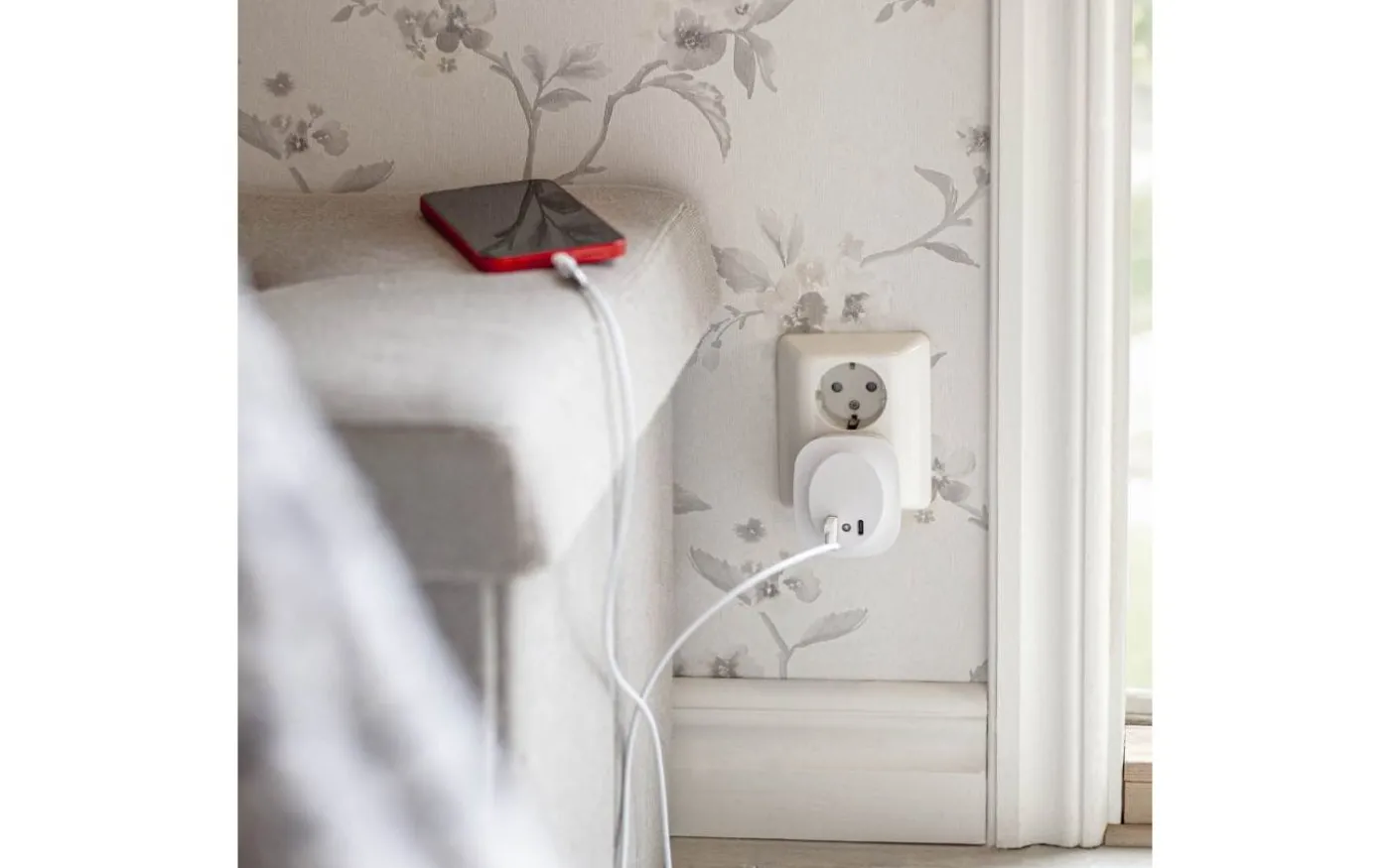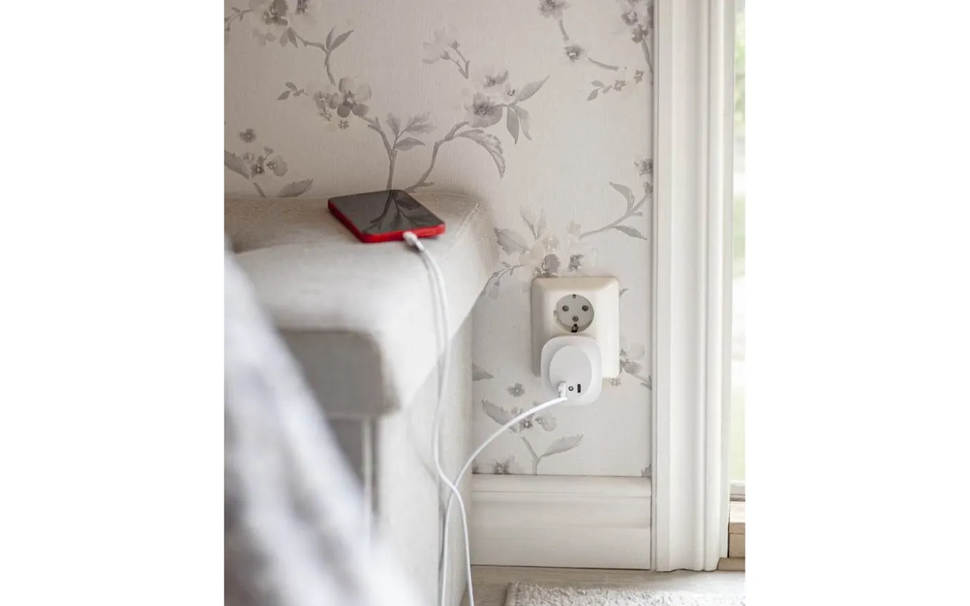 Lampan tänds automatiskt när ljusnivån i rummet understiger 30 lux och sprider ett mjukt sken runtom sidorna under kväll och natt. Plugga bara in den i ett vägguttag för både belysning och praktisk laddning av dina enheter.