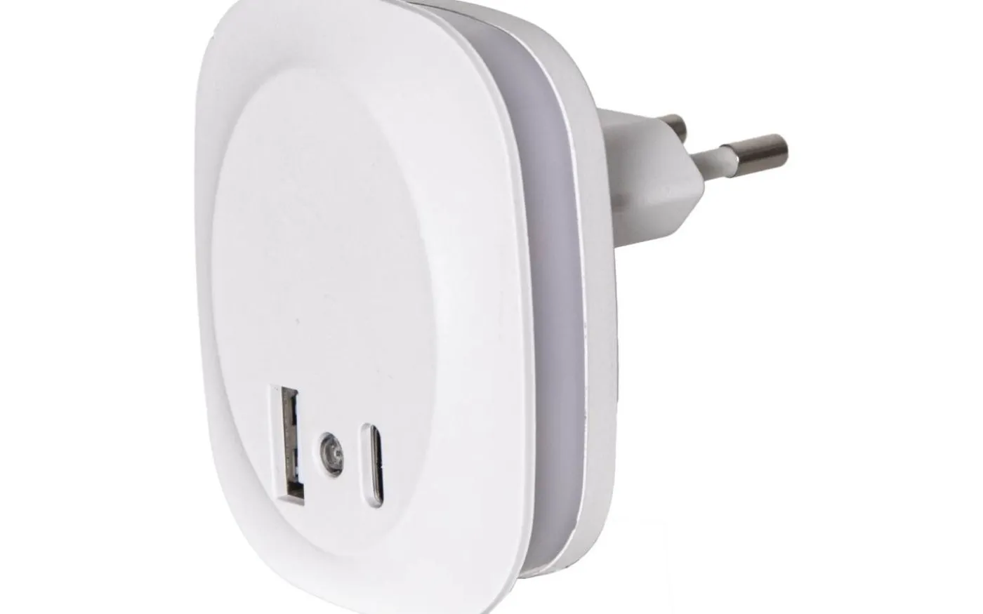 En smidig nattlampa med inbyggd skymningssensor och dubbla USB-uttag (A och C, 5V/1A).