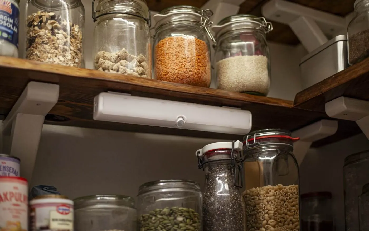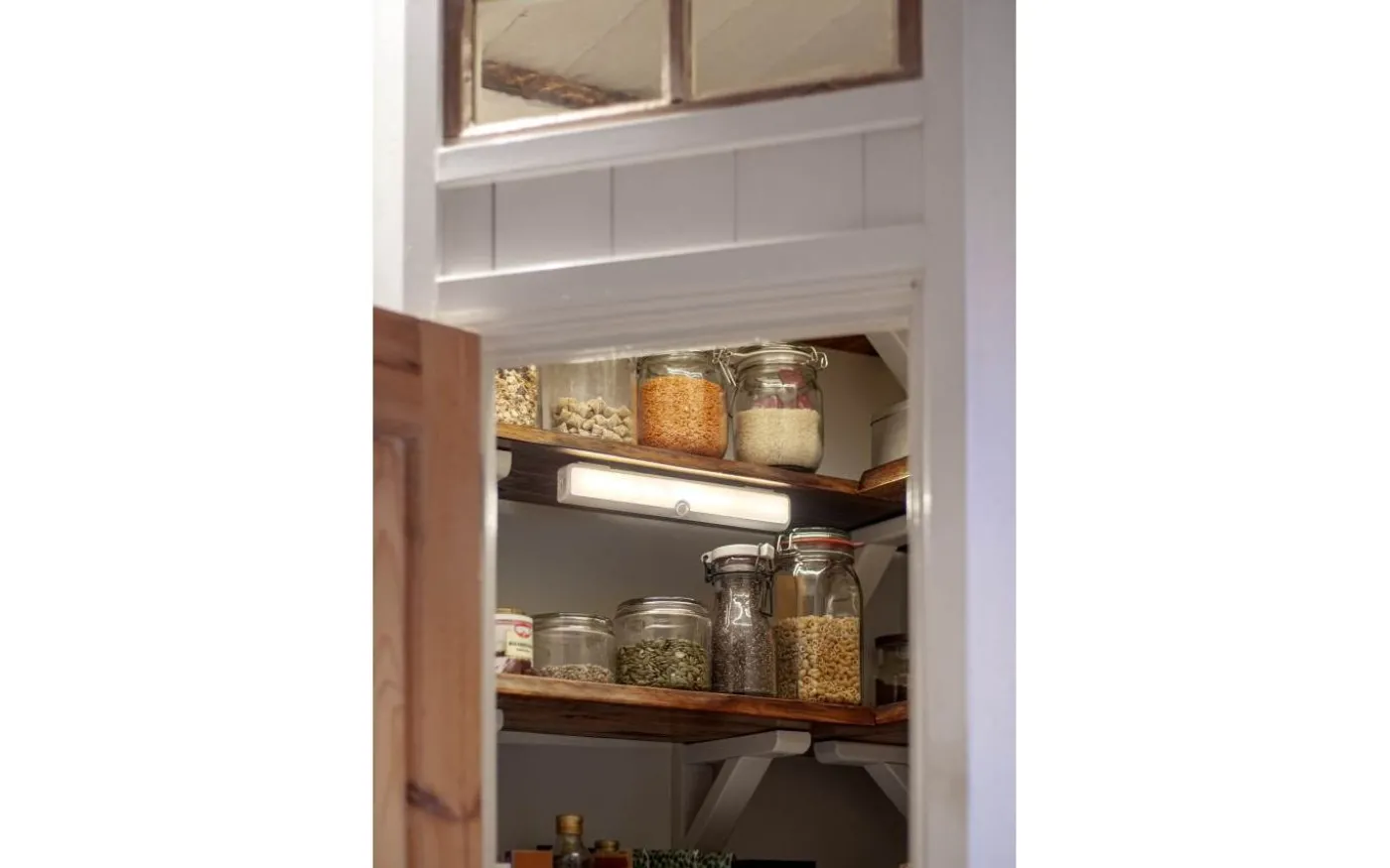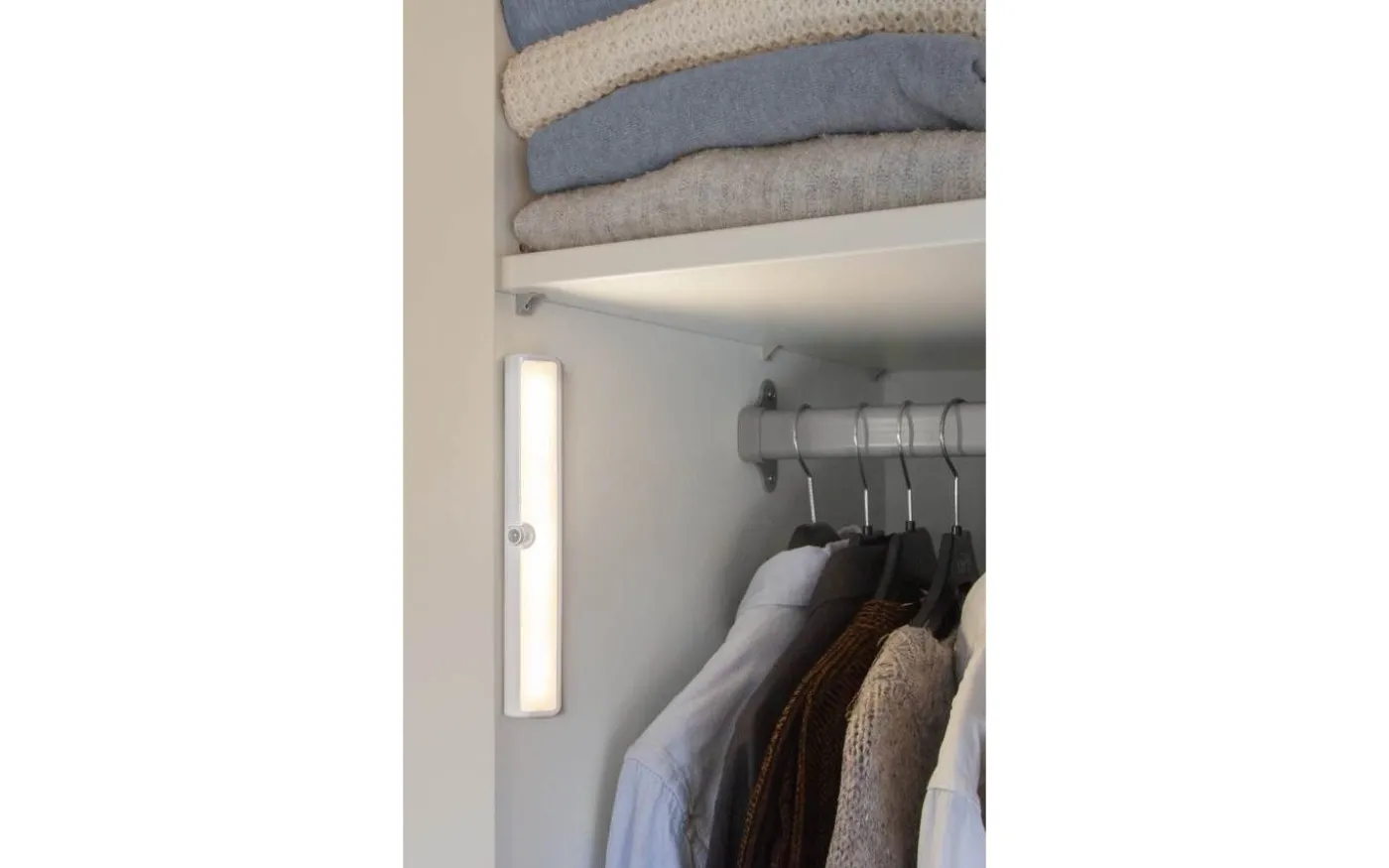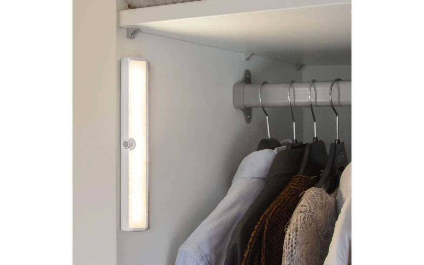 Välj mellan rörelsestyrt ljus i AUTO-läge eller fast sken i ON-läge. Ljusstyrkan är dimbar i tre steg – 25 %, 50 % eller 100 % med hjälp av ett reglage. Utrustad med justerbara väggfästen på baksidan och anpassad för inomhusbruk.