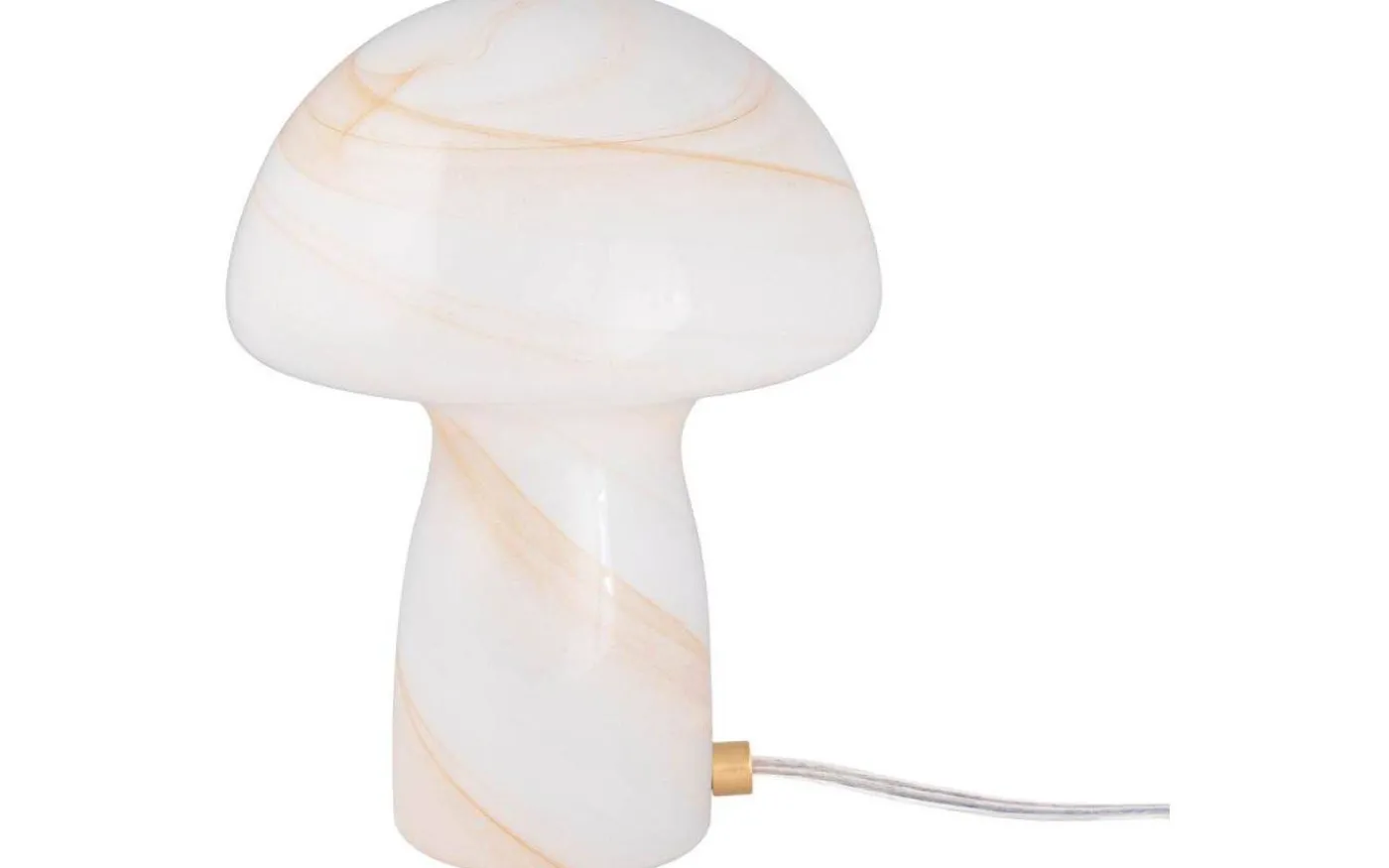 Med inspiration från skogen kommer denna nätta svamplampa med sitt vackra vita och ljusbruna glas. Den ger ett behagligt soft ljus och gör sig fint i en bokhylla eller på ett sidebord. Lampan är tillverkad i vitt glas med mönster i ljusbrunt samt en 200 cm lång transparent kabel med brytare.