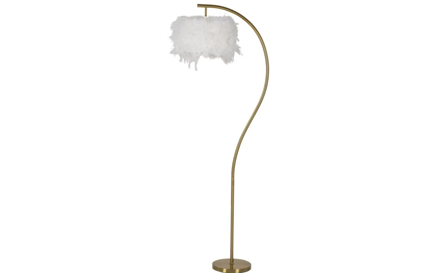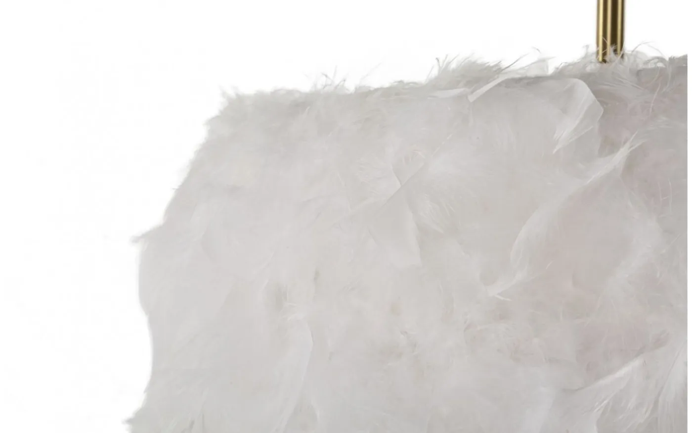 Bordslampa i gyllene metall med en välvd och linjär design komplett med elegant lampskärm gjord av syntetiska fjädrar.