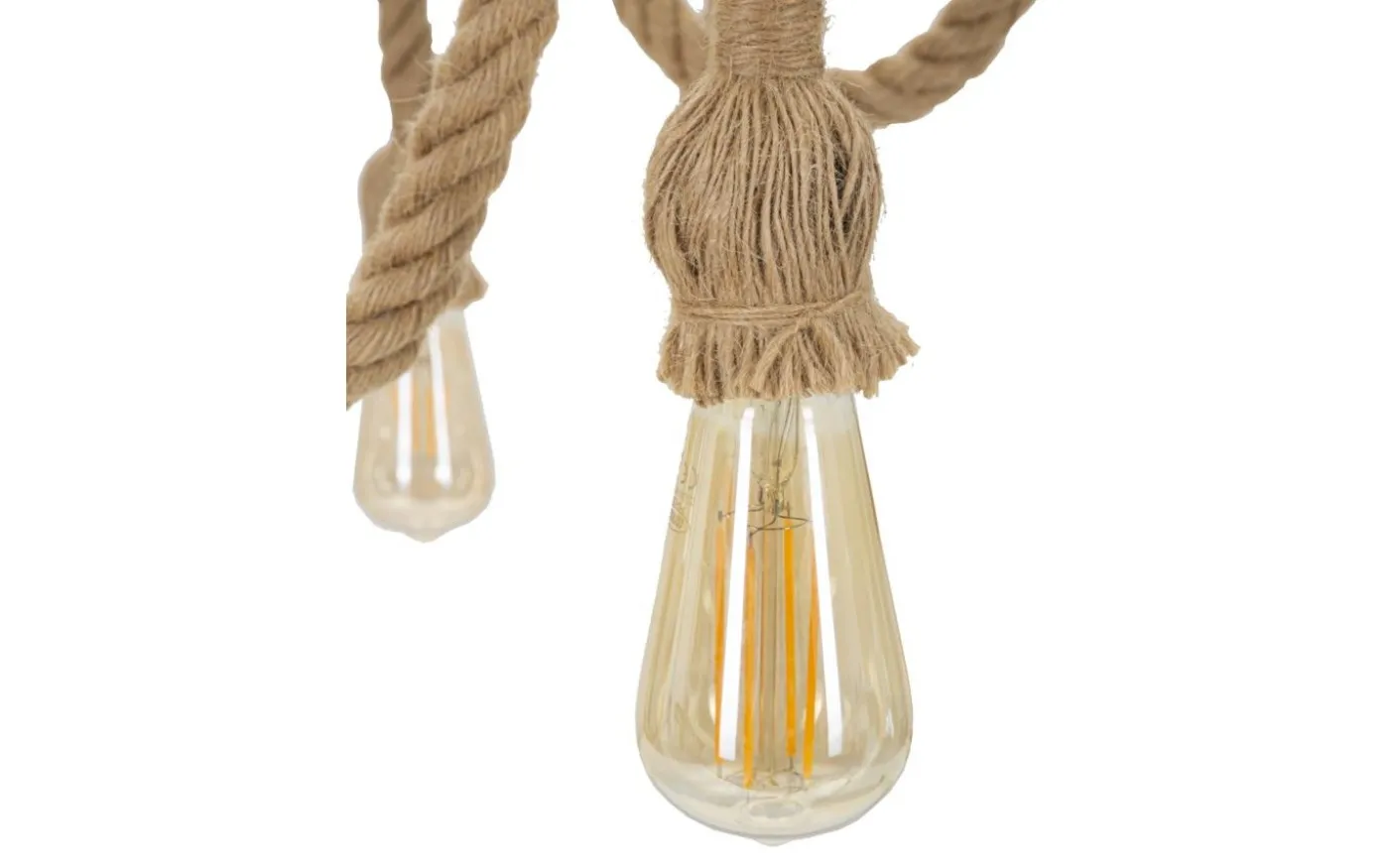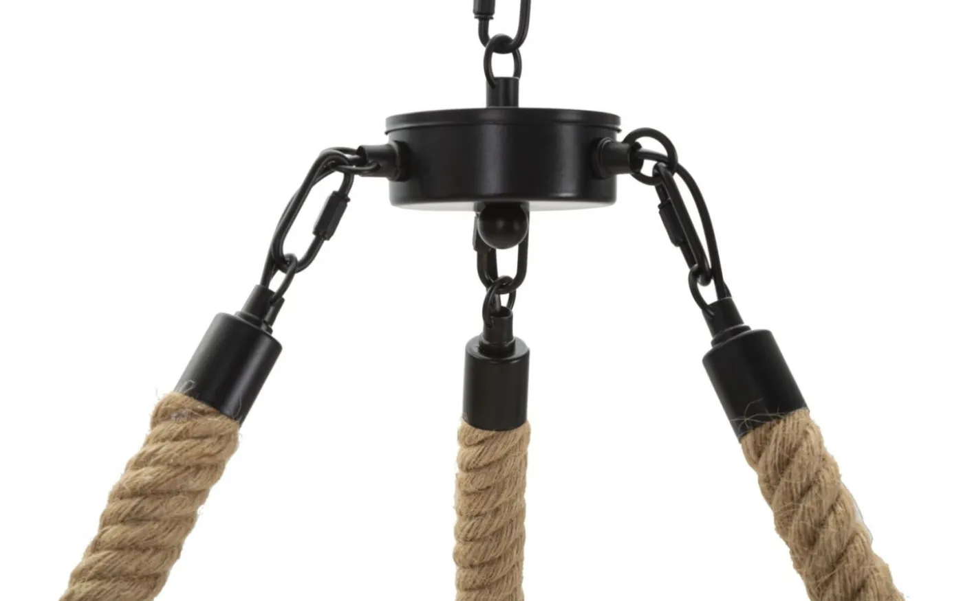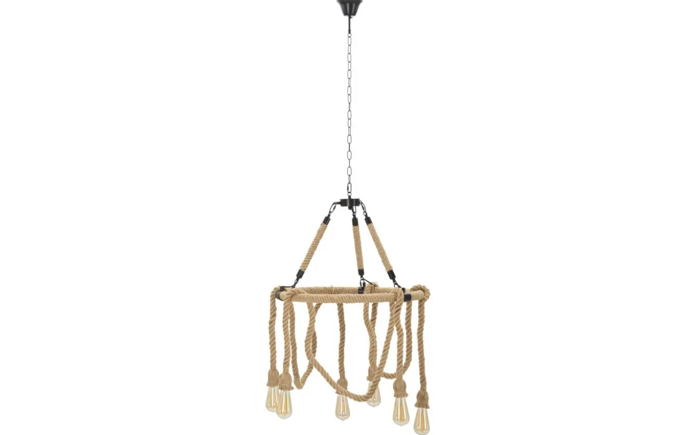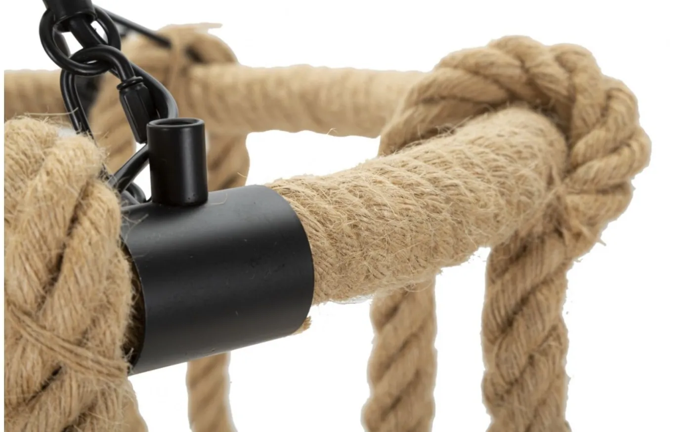 Rund taklampa i metall och rep med 6 ljuspunkter med enkel design som påminner om livet i lanthus.