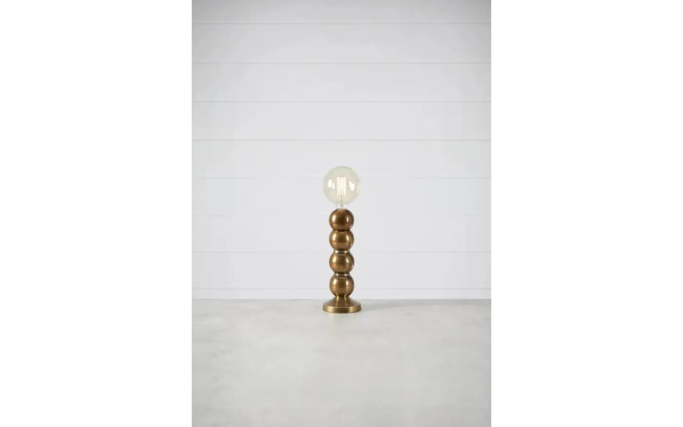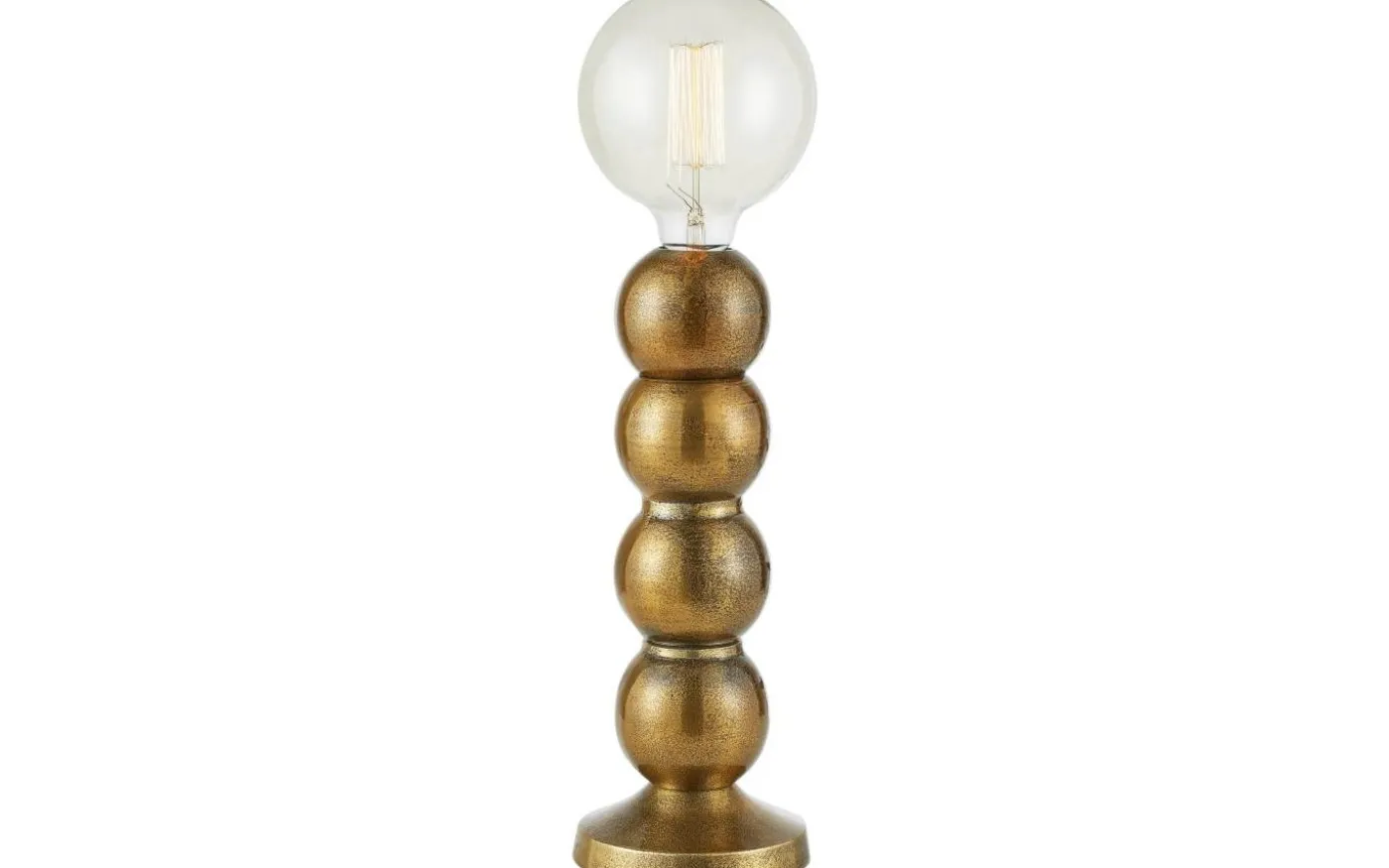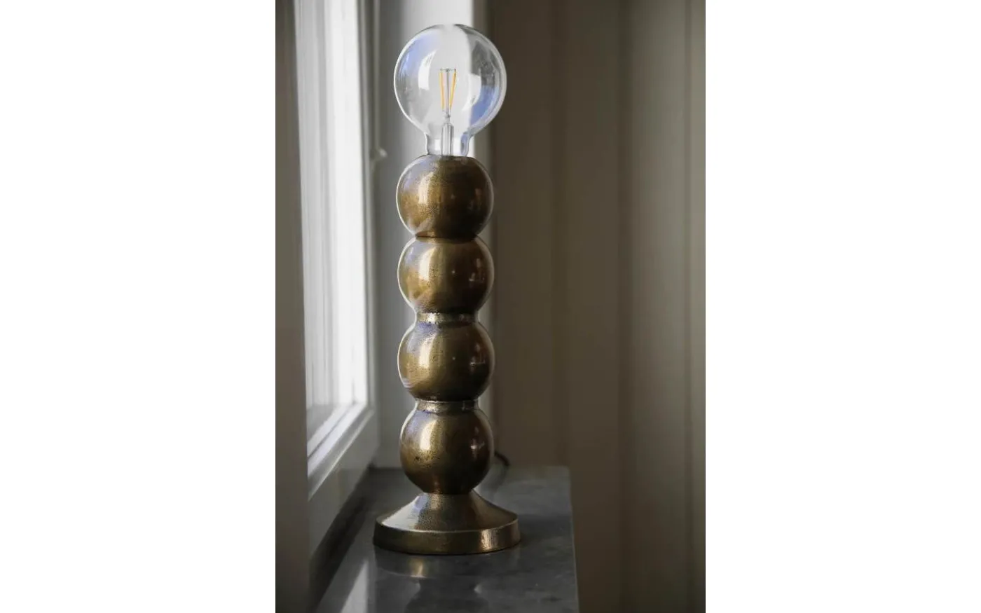 Bordslampa i en rustik stil med fyra runda glober och yta i mörkt guldig nyans . Välj till en dekorativ ljuskälla (ingår ej) som passar din stil. Passar fint i ett fönster eller på en smal skänk. Lampans totalhöjd är 33 cm exklusive ljuskälla med en diameter på 12,5 cm. Finns även i silverfärgad metall.