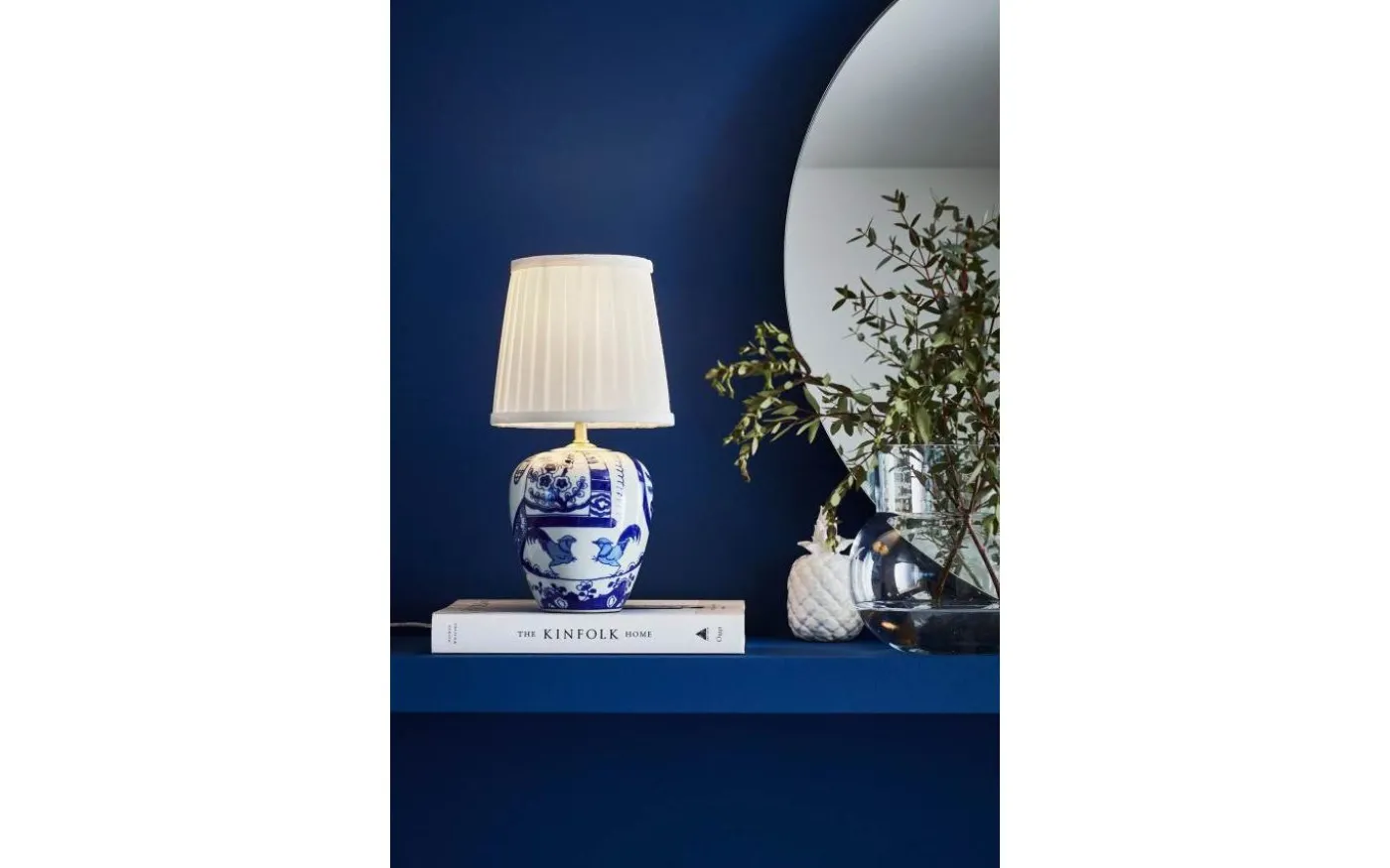Härlig bordslampa i vitt porslin med blått dekorativt mönster som avslutas med en fin vit textilskärm. Lampan har en E14 sockel, ljuskälla ingår ej.