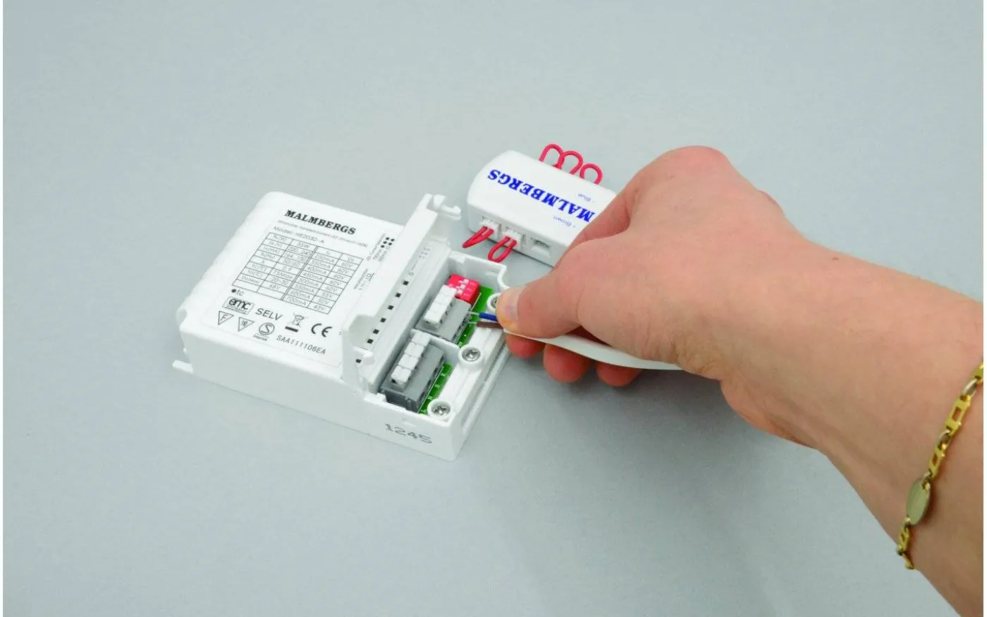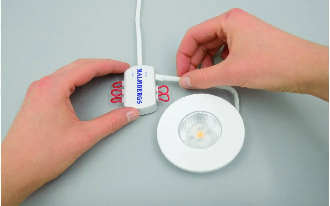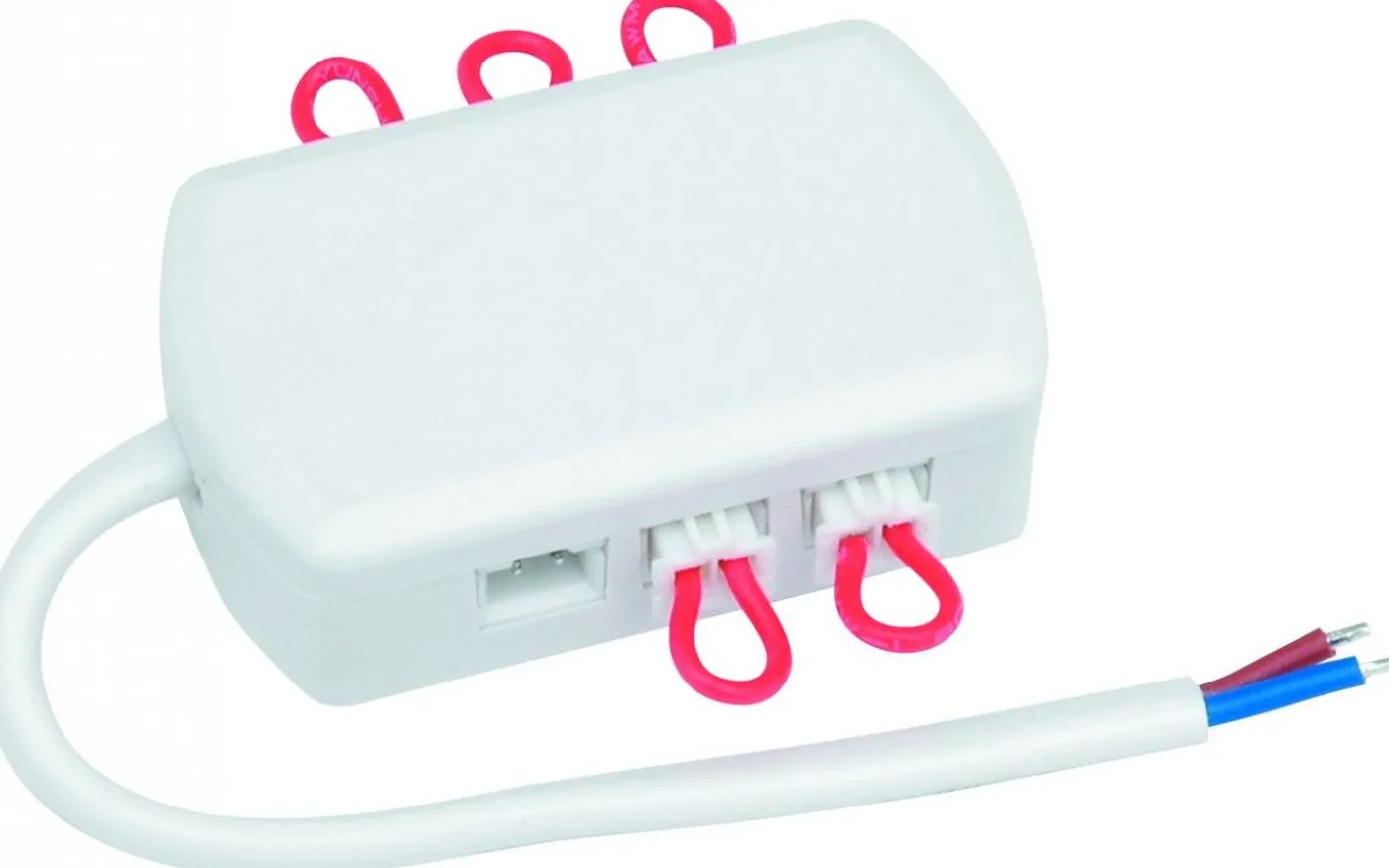 Används för att koppla in 1-6 st spottar till ett drivdon. Inkopplingsboxen är seriekopplad, därför behövs byglar på de utgångar som ej utnyttjas.