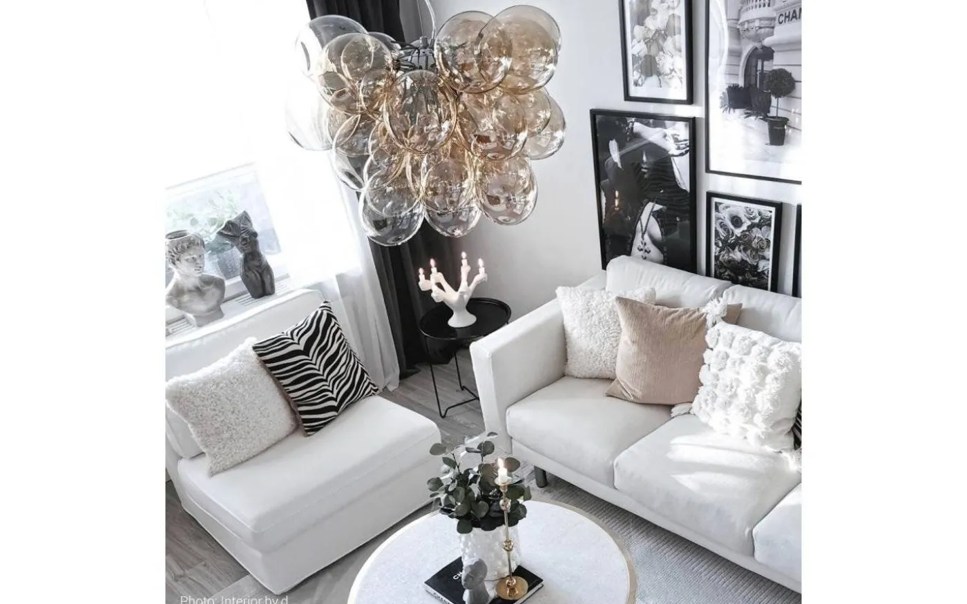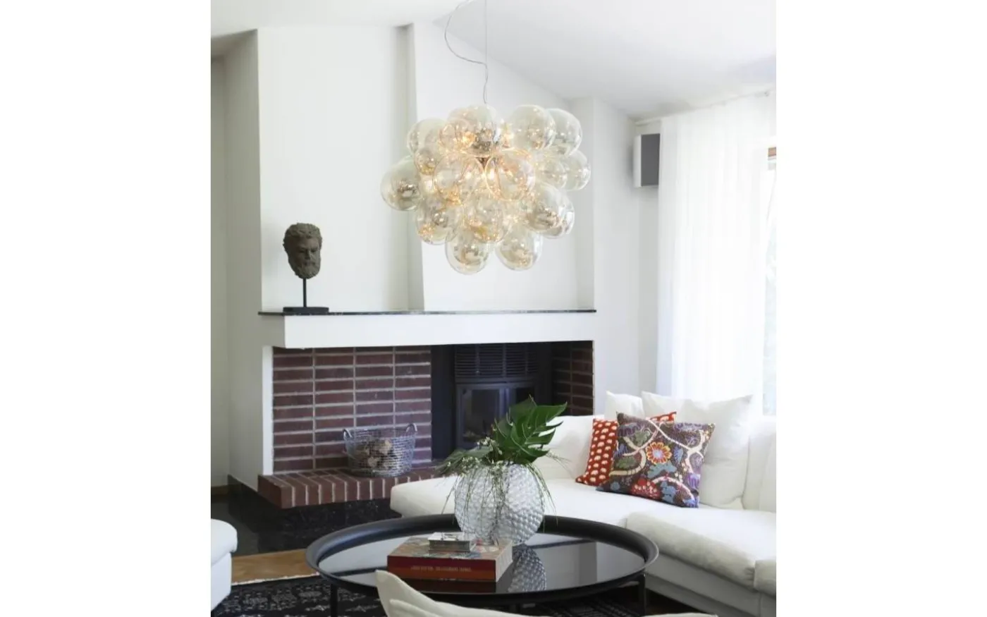 Gross från välkända By Rydéns är en snygg taklampa med upphäng i blank krom kombinerat med 32st munblåsta, amberfärgade glaskulor som ger lampan ett exklusivt och trendigt intryck. De skira glaskulorna släpper genom ett fantastiskt ljusflöde. Till denna taklampa behöver du 8st G9 ljuskällor, dessa säljes separat – se passande förslag under tillbehör.