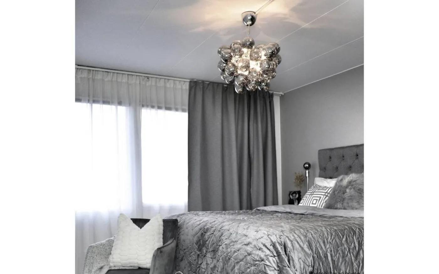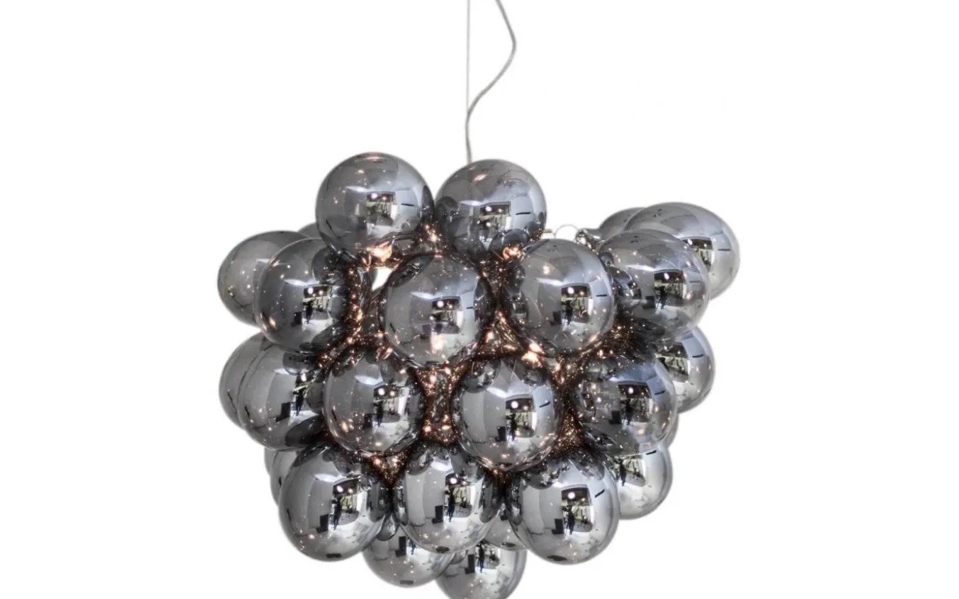 Gross från välkända By Rydéns är en snygg taklampa med upphäng i blank krom kombinerat med 32st munblåsta, rökfärgade glaskulor som ger lampan ett exklusivt och trendigt intryck. De skira glaskulorna släpper genom ett fantastiskt ljusflöde.