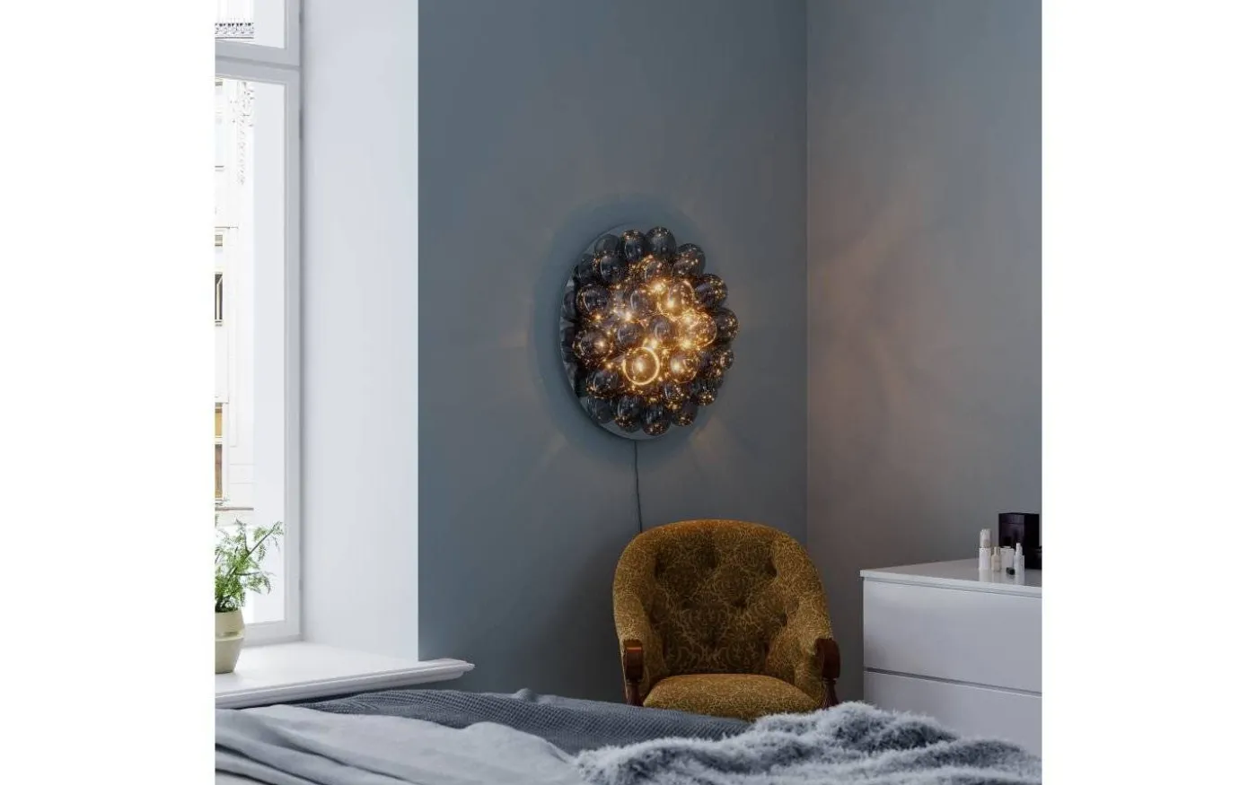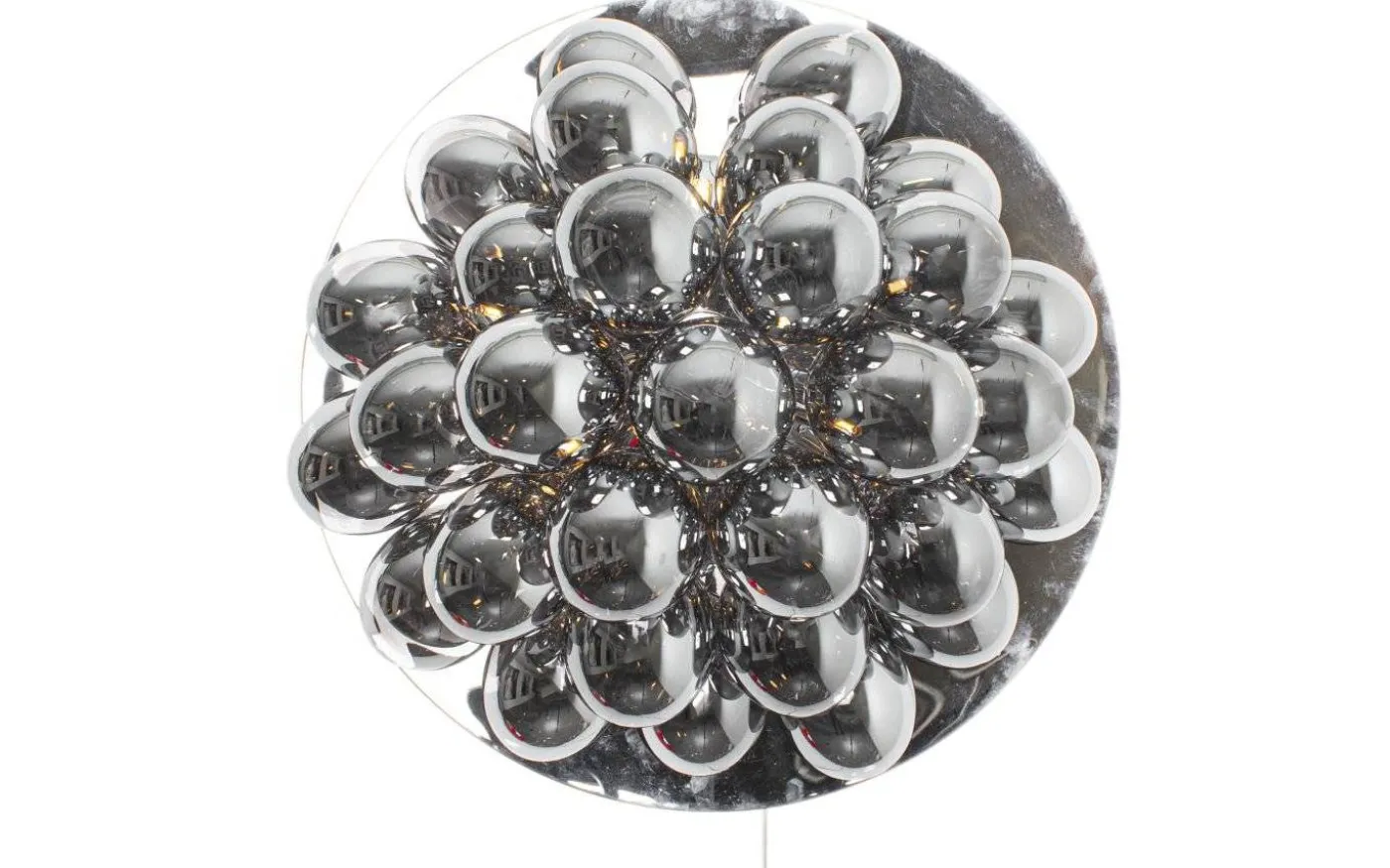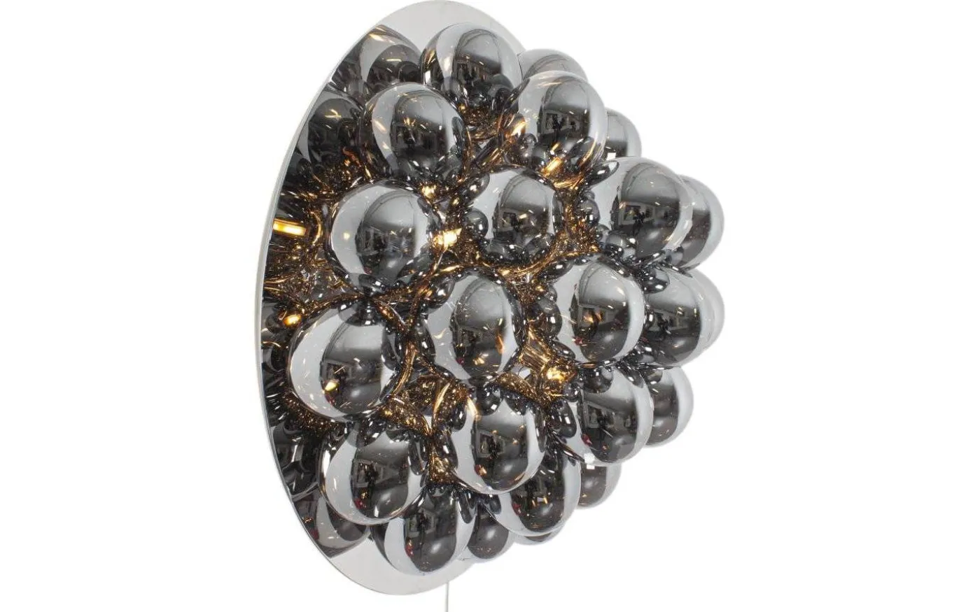 Underbara vägglampan Gross, från välkända By Rydéns, har en stomme i blank kromfärgad metall och totalt 30 stycken rökfärgade glaskulor. Varje glaskula har en diameter på 10 cm.