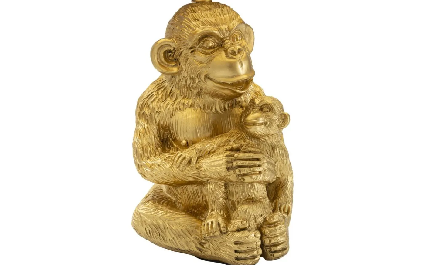 Bordslampa i form av en gyllene sittande apa med svart tygskärm