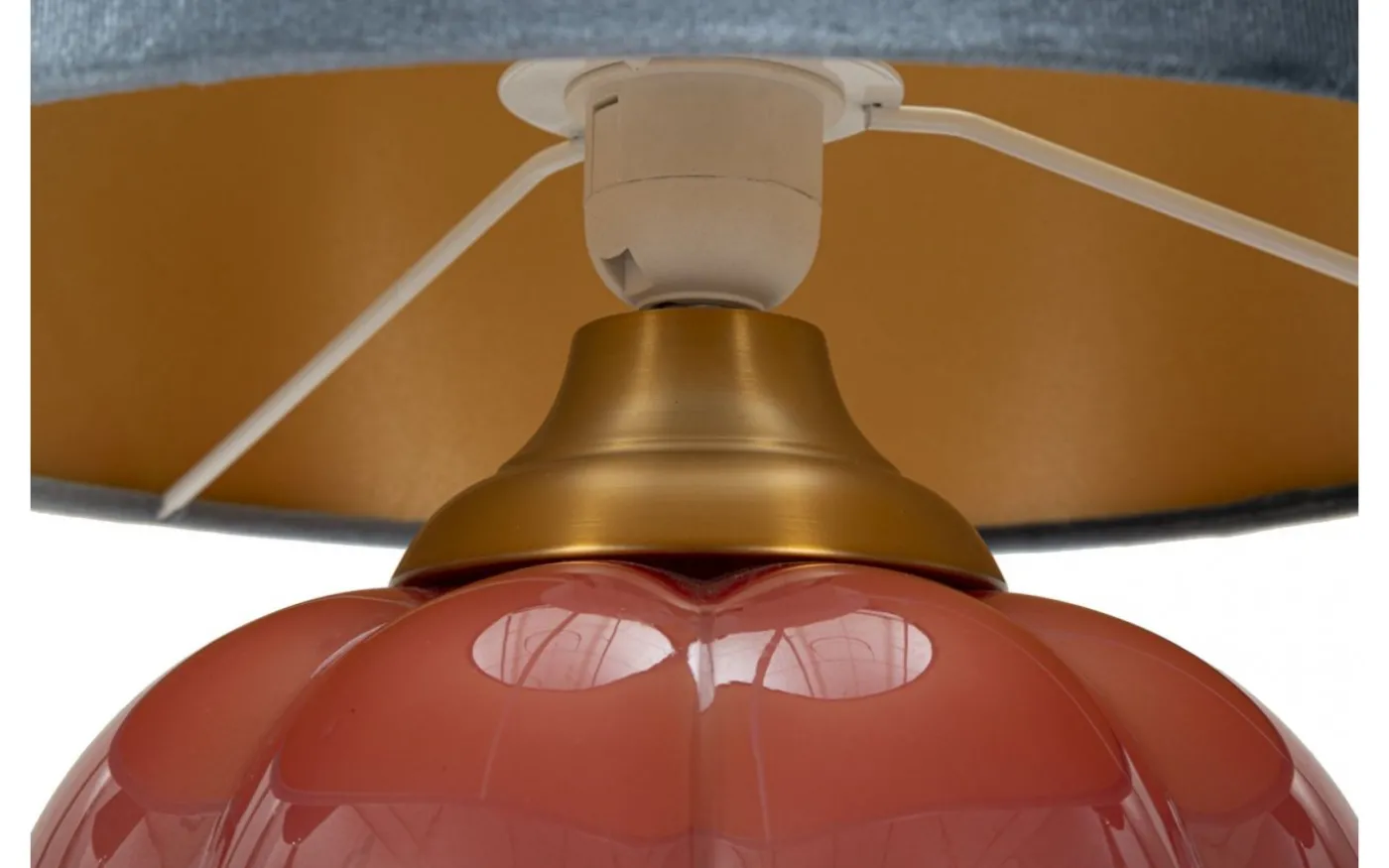 Lampa med röd glasfot, perfekt för en modern miljö eller en kreativ studio. Komplett med blå sammetsnyans.