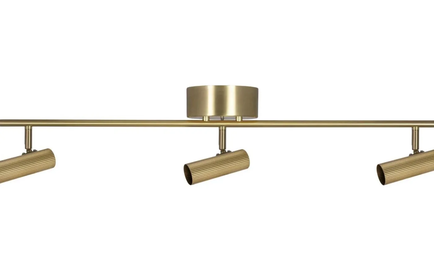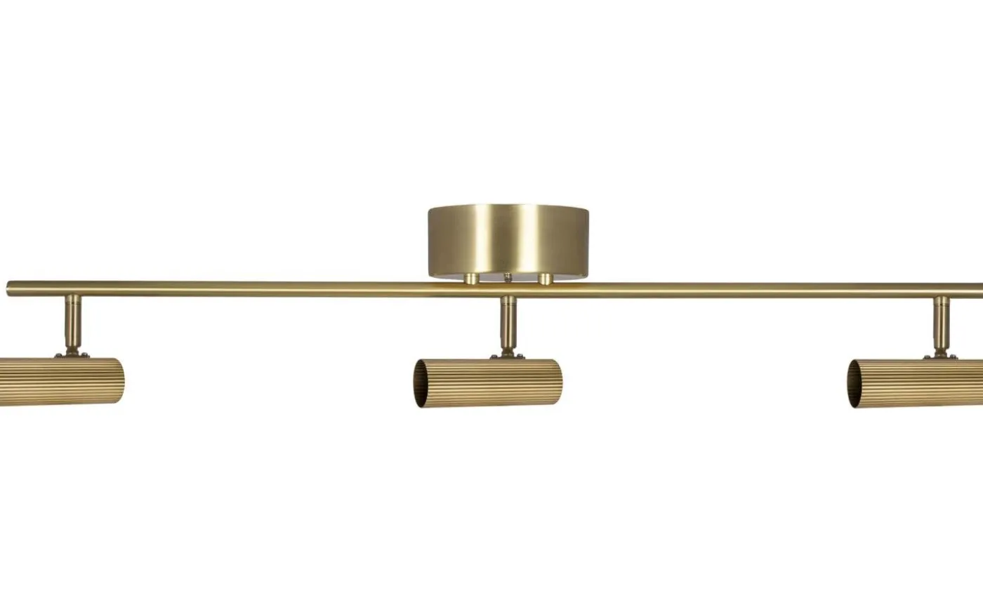 Hubble takspotlight från Globen Lighting är en modern avlång takspotlight med tubformade och räfflade skärmar i borstad mässingsfärgad metall. Takspotlighten har tre vinklingsbara lamphuvuden så att du enkelt kan rikta ljuset efter önskemål och behöv.