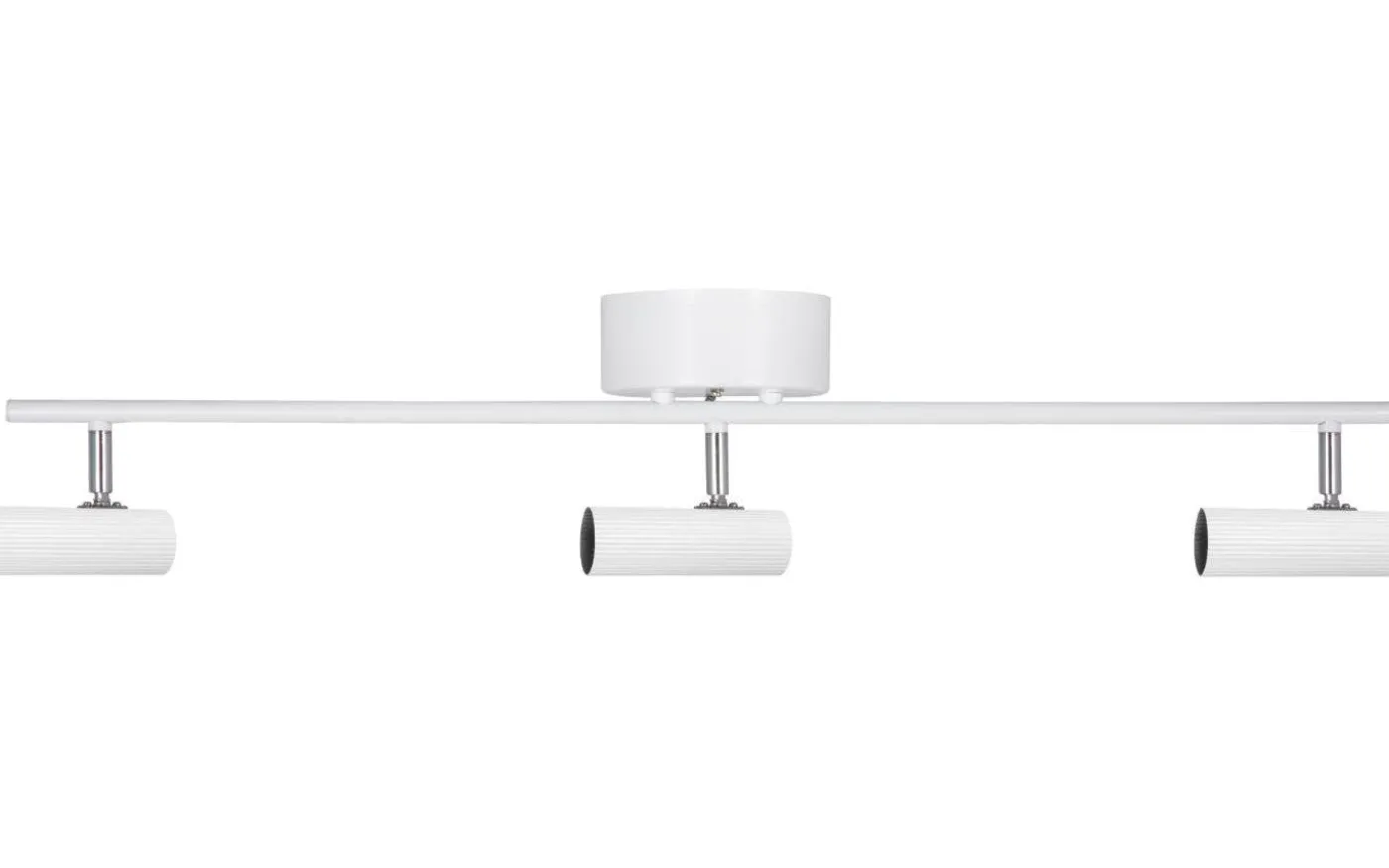 Hubble takspotlight från Globen Lighting är en modern avlång takspotlight med tubformade och räfflade skärmar i vitfärgad metall med kromfärgade detaljer. Takspotlighten har tre vinklingsbara lamphuvuden så att du enkelt kan rikta ljuset efter önskemål och behöv.