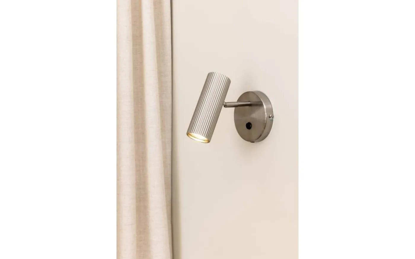 Stilrena vägglampan Hubble, från välkända Globen Lighting, är en läslampa i metall med en borstad stålfärgad finish. Det smala lamphuvudet, med en räfflad look, är riktbart vilket gör att denna vägglampa passar perfekt som läslampa intill sängen.
