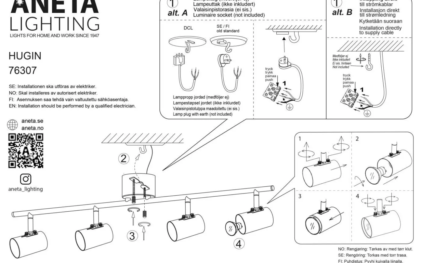 Hugin takspotlight från Aneta är en enkel och stilren takspotlight med fyra justerbara lamphuvuden som gör det enkelt att rikta efter önskemål och behov.
