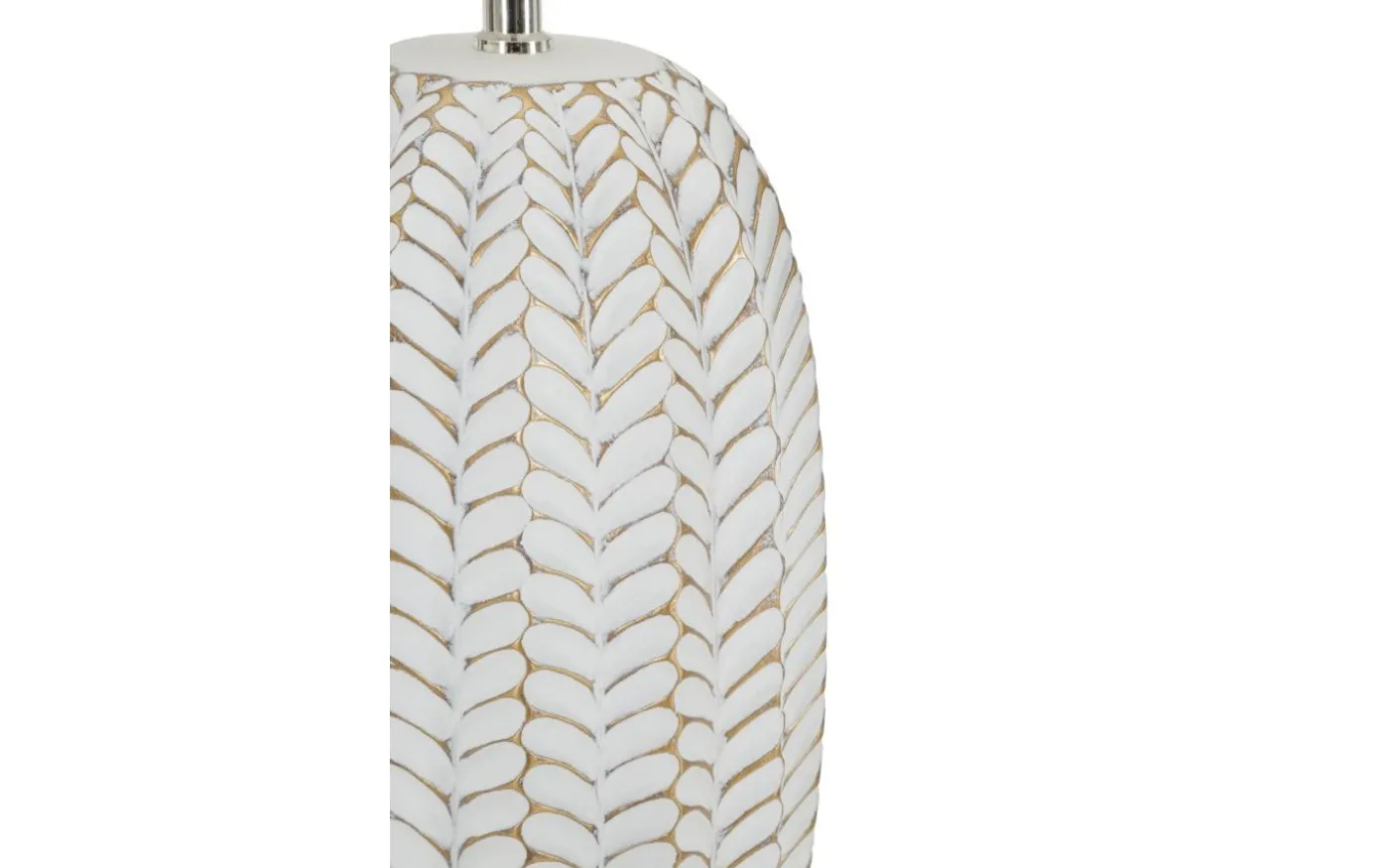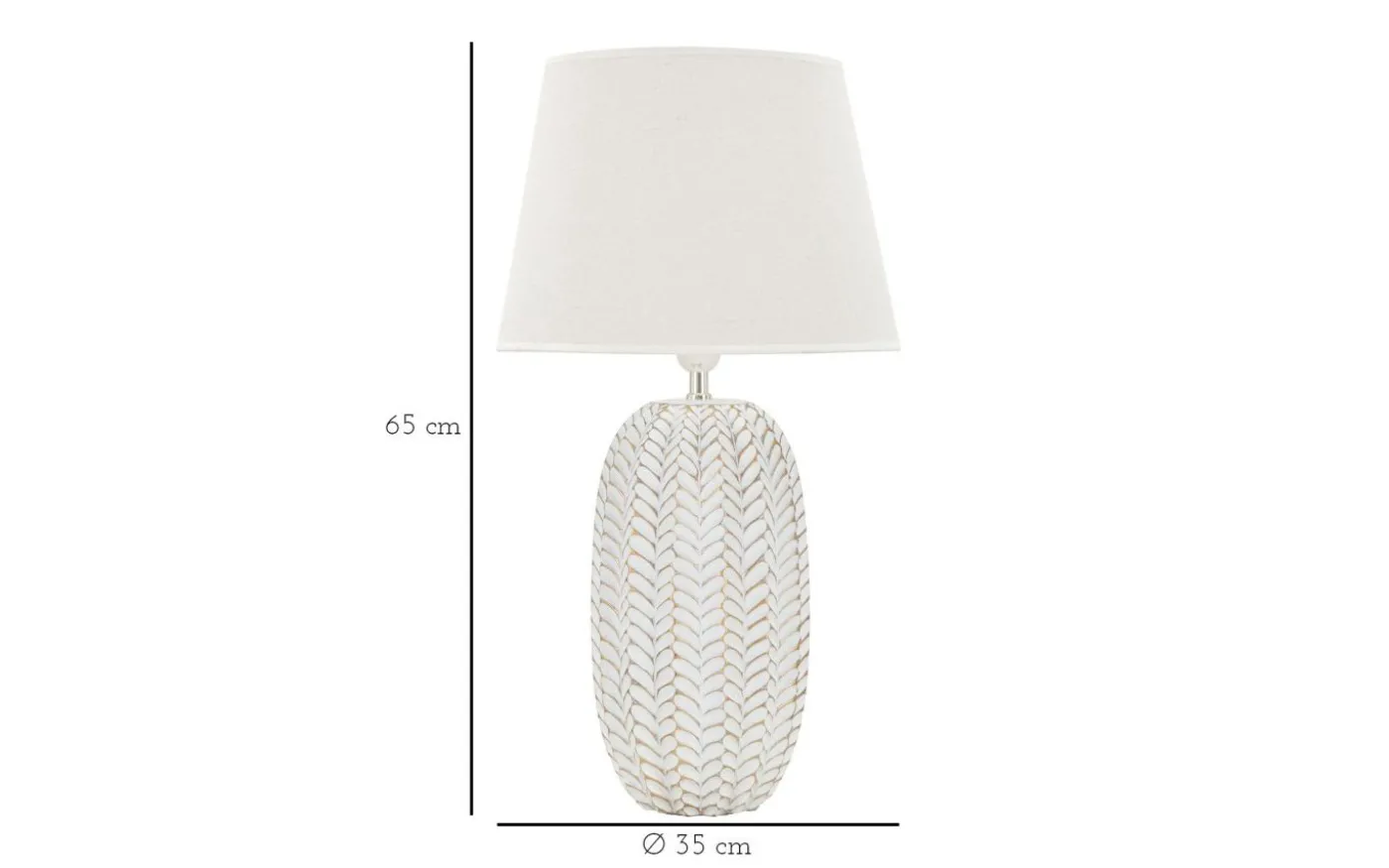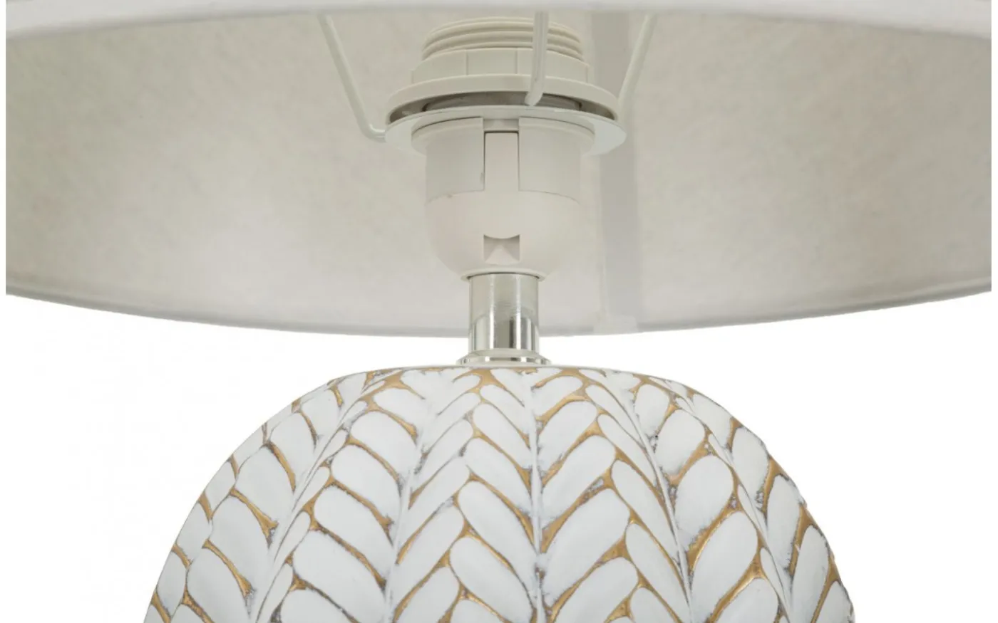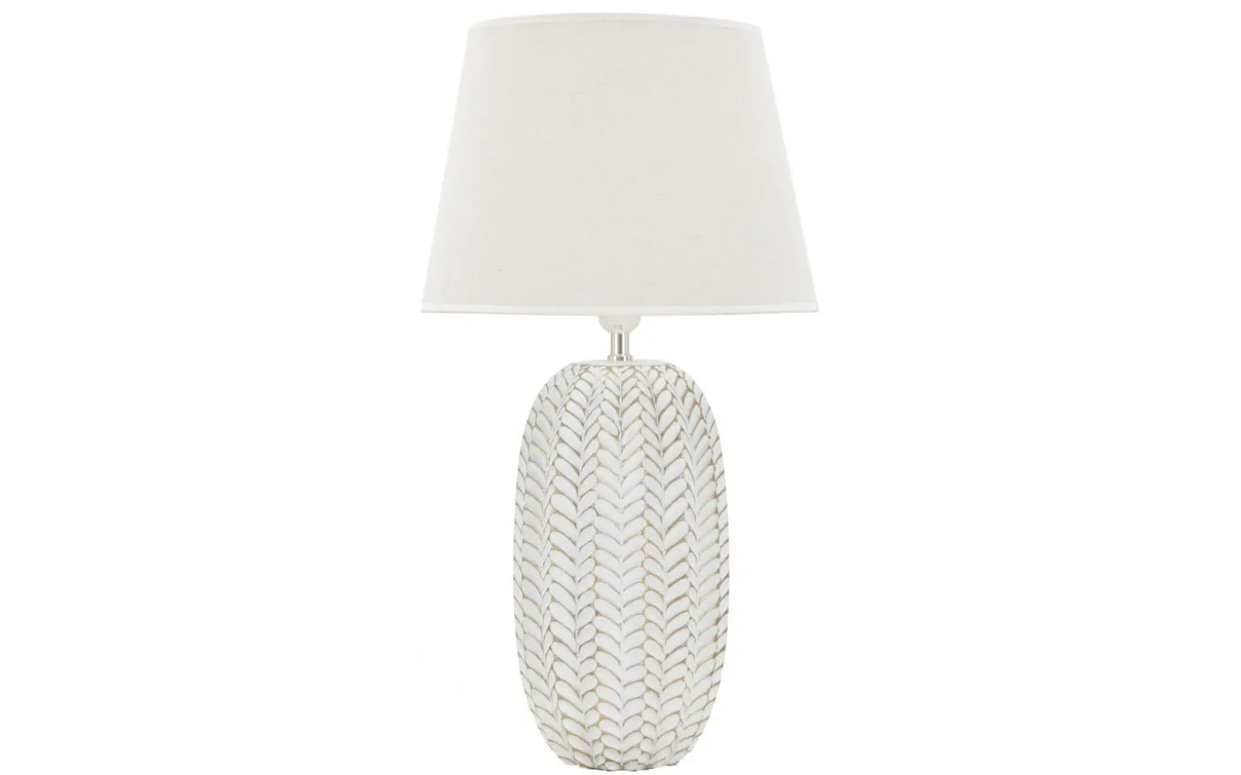 Bordslampa i harts med eleganta blomdekorationer i relief. Komplett med lampskärm i vit tyg.