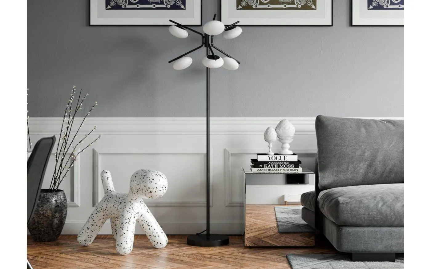 Imperia golvlampa från By Rydens är en maffiga, supercool golvlampa med stomme i mattsvart metall med tre stycken vinklade armar som bildar totalt 6st lamphållare som toppas med en matt vit oval glaskupa. Glaskuporna är tjocka och rejäla och inger en lyxig känsla.