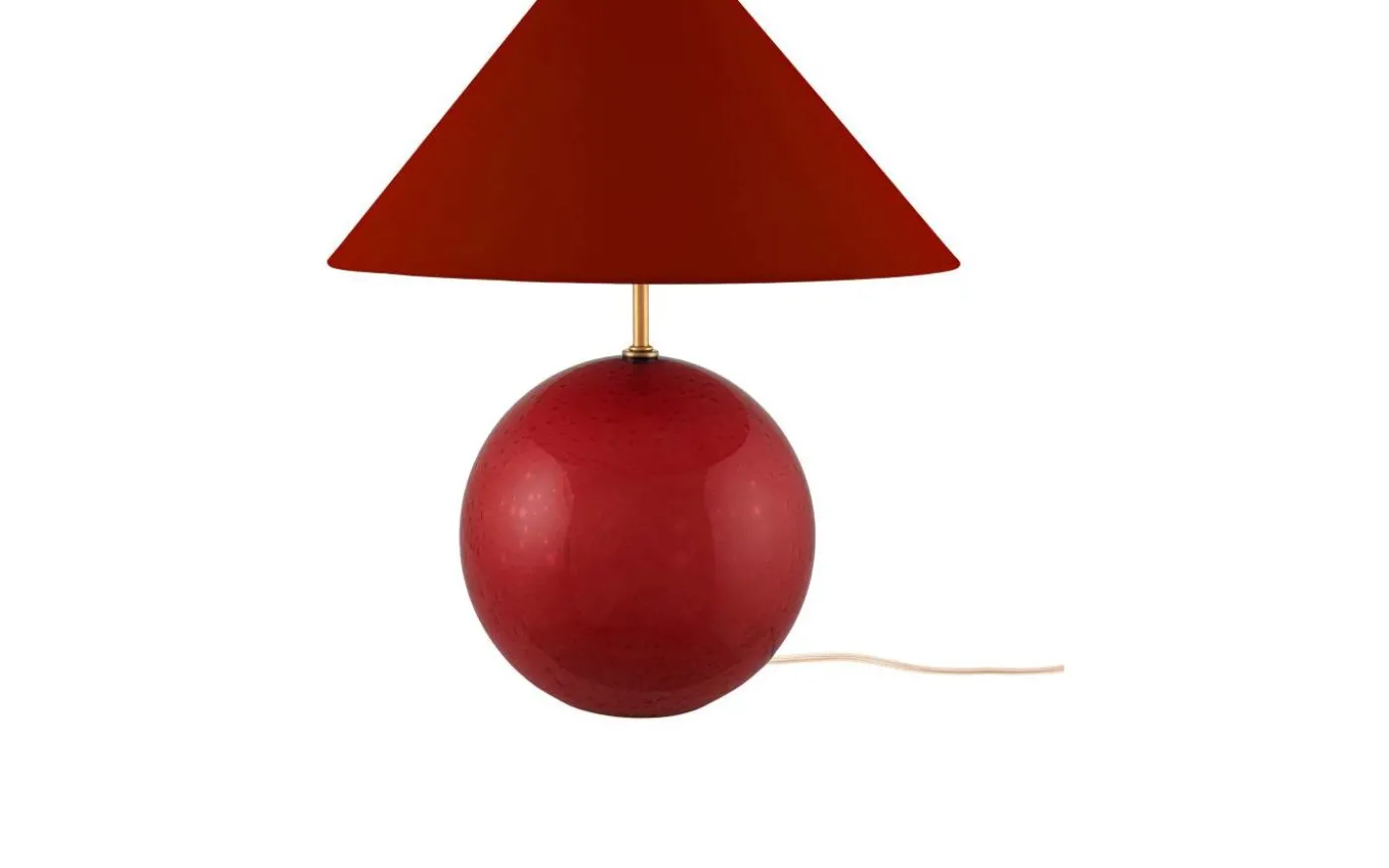 Iris från Globen Lighting är en charmig bordslampa med färgstark personlighet. Den har en rund lampfot i färgat glas med dekorativa luftbubblor och en matchande tygskärm i bomull. Varje lampa är unik tack vare glasets bubblor.