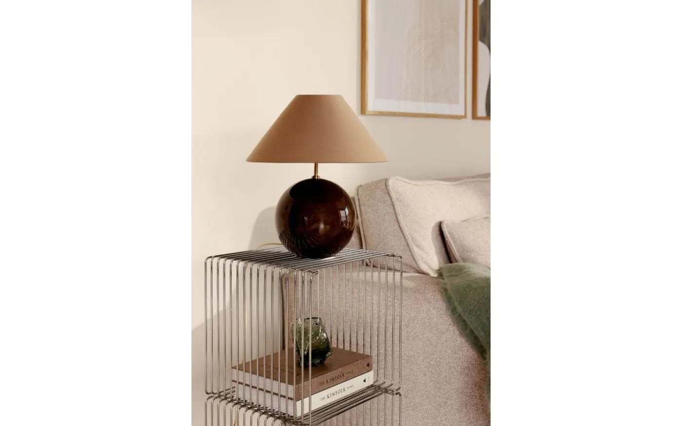 Iris från Globen Lighting är en charmig bordslampa med färgstark personlighet. Den har en rund lampfot i färgat glas med dekorativa luftbubblor och en matchande tygskärm i bomull. Varje lampa är unik tack vare glasets bubblor.