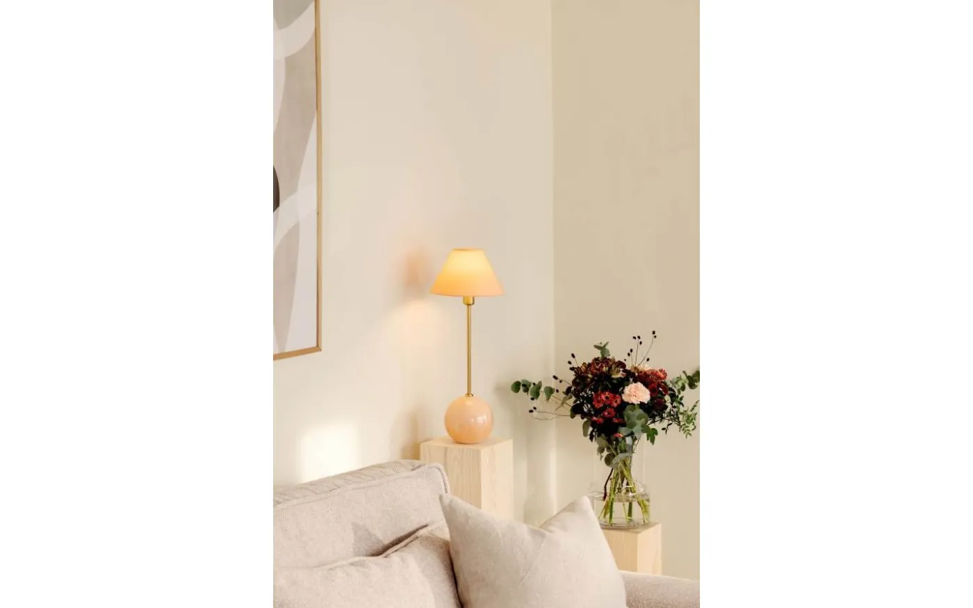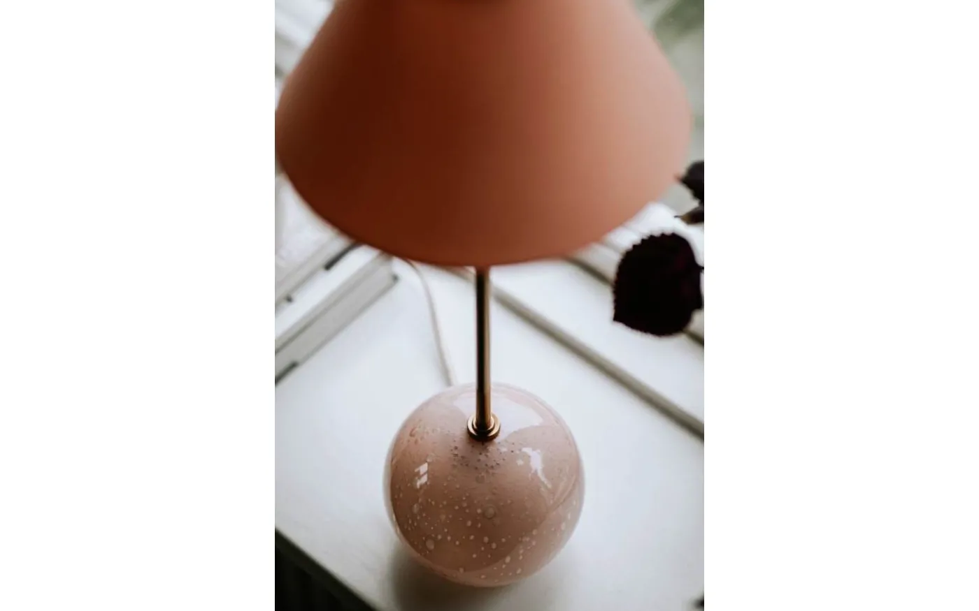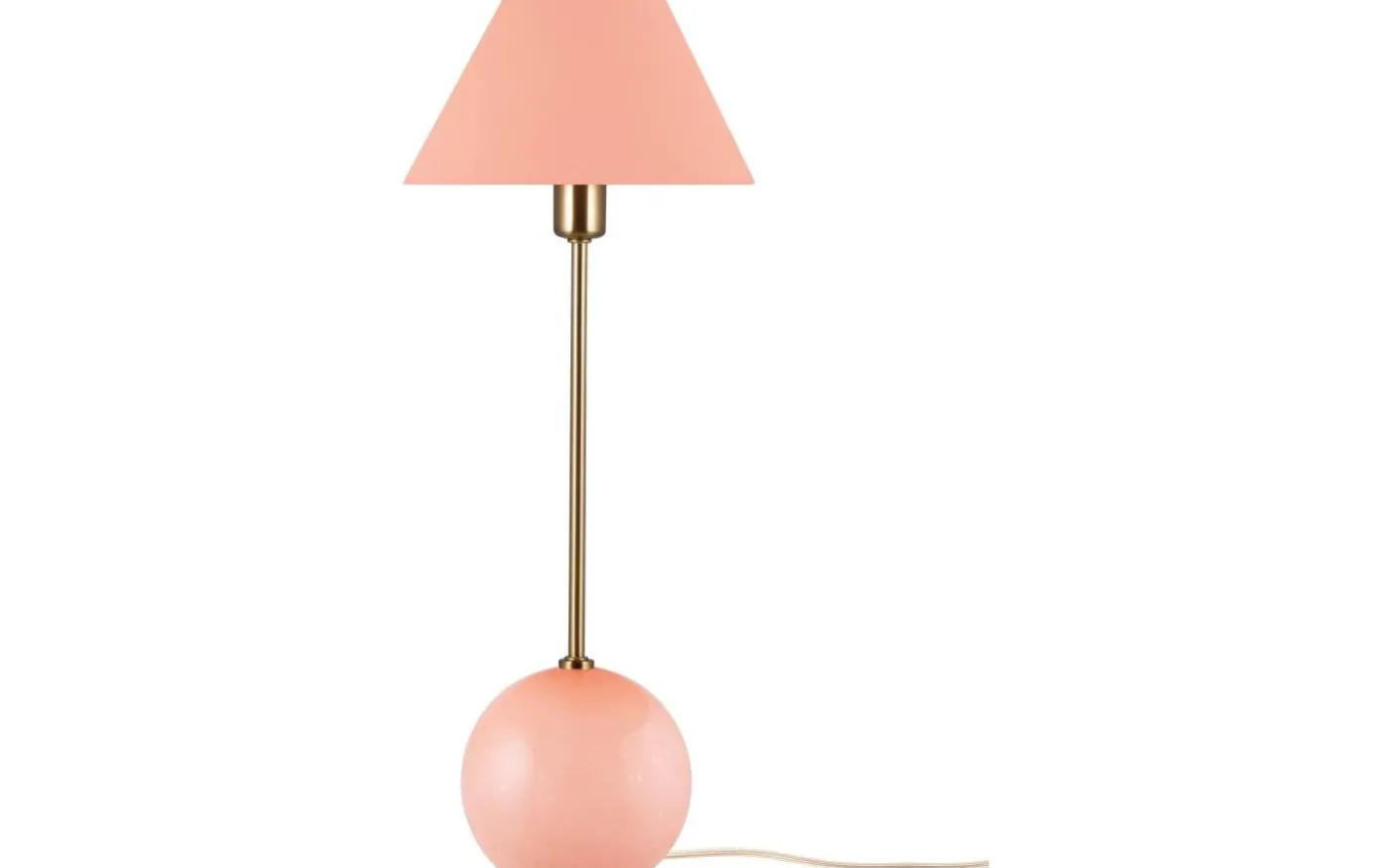 Iris från Globen Lighting är en charmig bordslampa med färgstark personlighet. Den har en rund lampfot i färgat glas med dekorativa luftbubblor och en matchande tygskärm i bomull. Varje lampa är unik tack vare glasets bubblor.