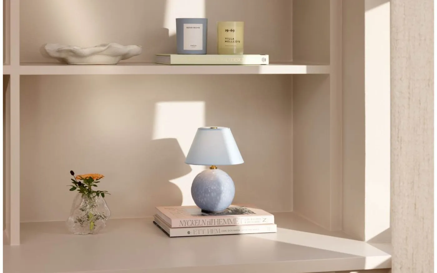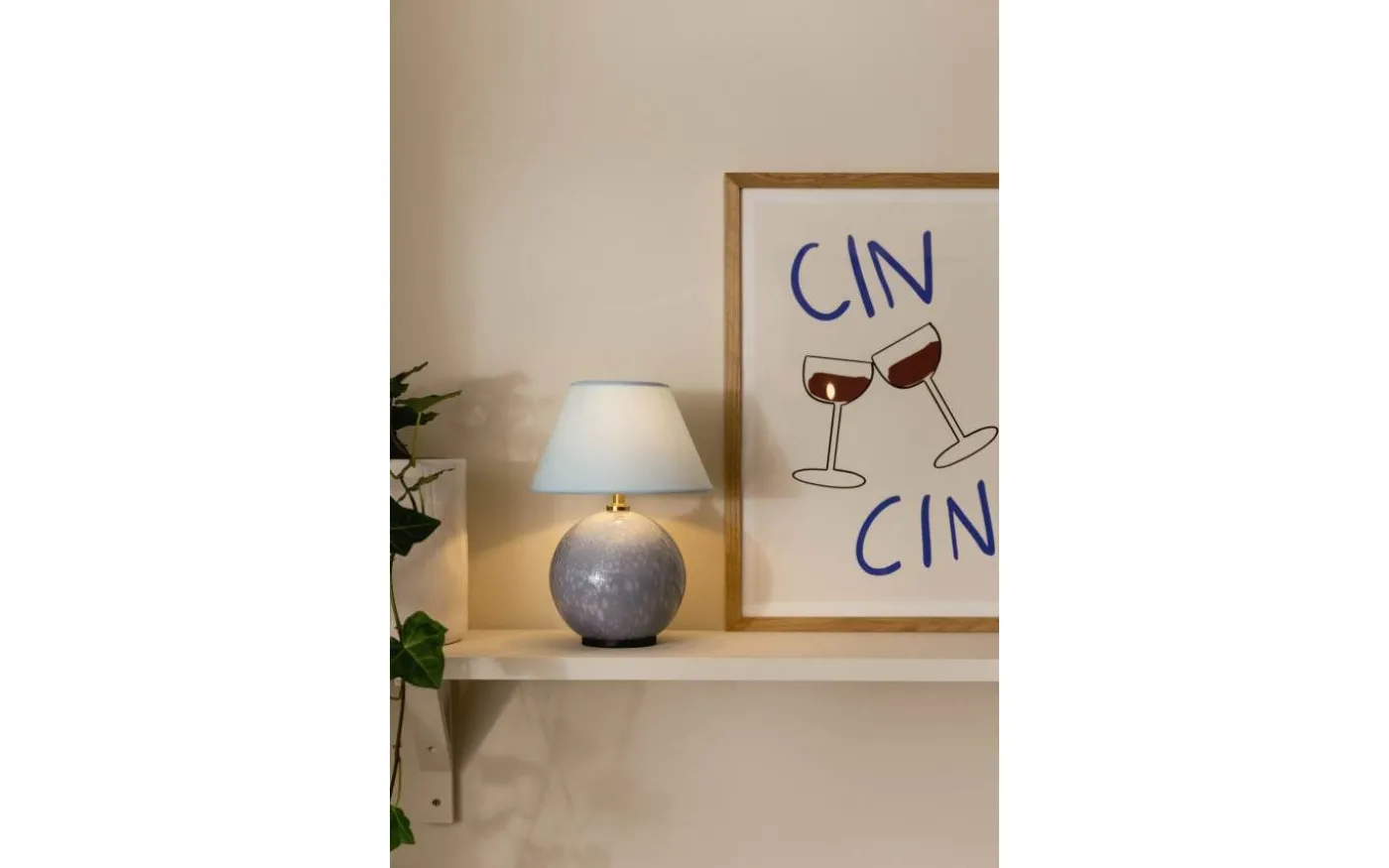 Iris från Globen Lighting är en uppladdningsbar bordslampa med färgstark personlighet. Den har en rund lampfot i färgat glas med dekorativa luftbubblor och en matchande tygskärm i bomull. Varje lampa är unik tack vare glasets bubblor.