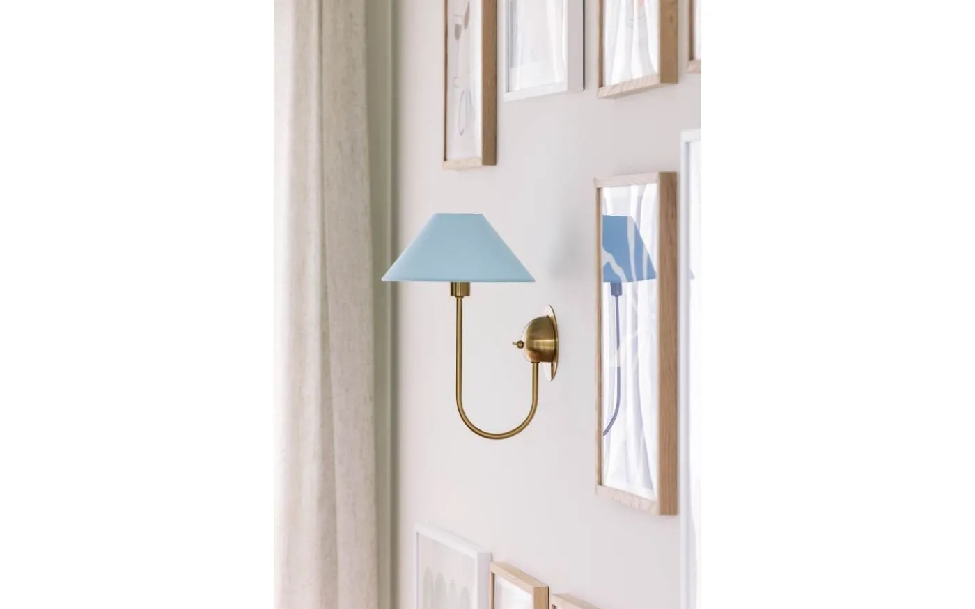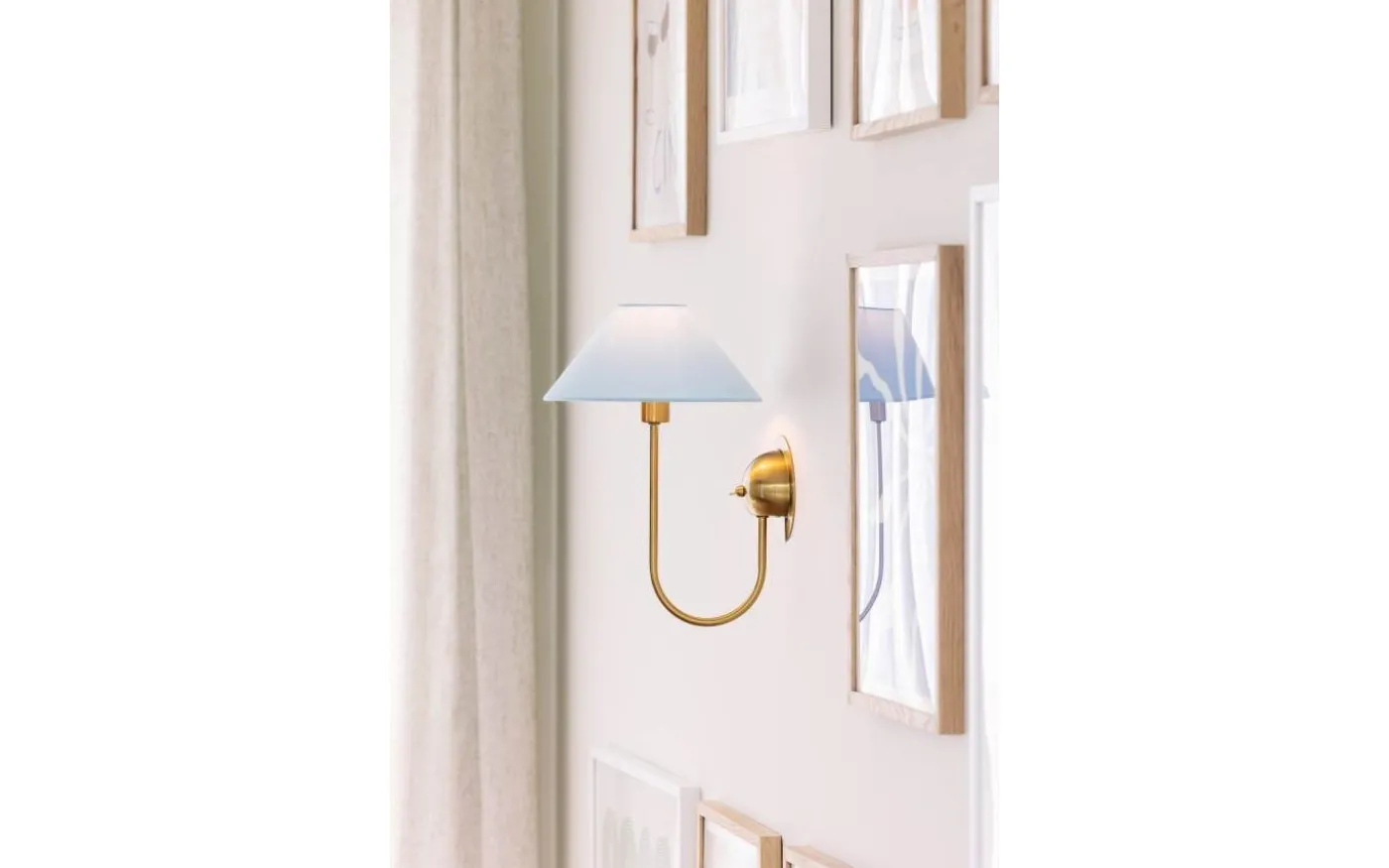 Iris från Globen Lighting är en elegant vägglampa med stomme i borstad mässing och en textilskärm (ringfäste) som sprider ett mjukt och behagligt ljus.