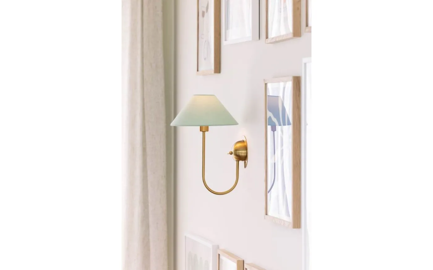 Iris från Globen Lighting är en elegant vägglampa med stomme i borstad mässing och en textilskärm (ringfäste) som sprider ett mjukt och behagligt ljus.
