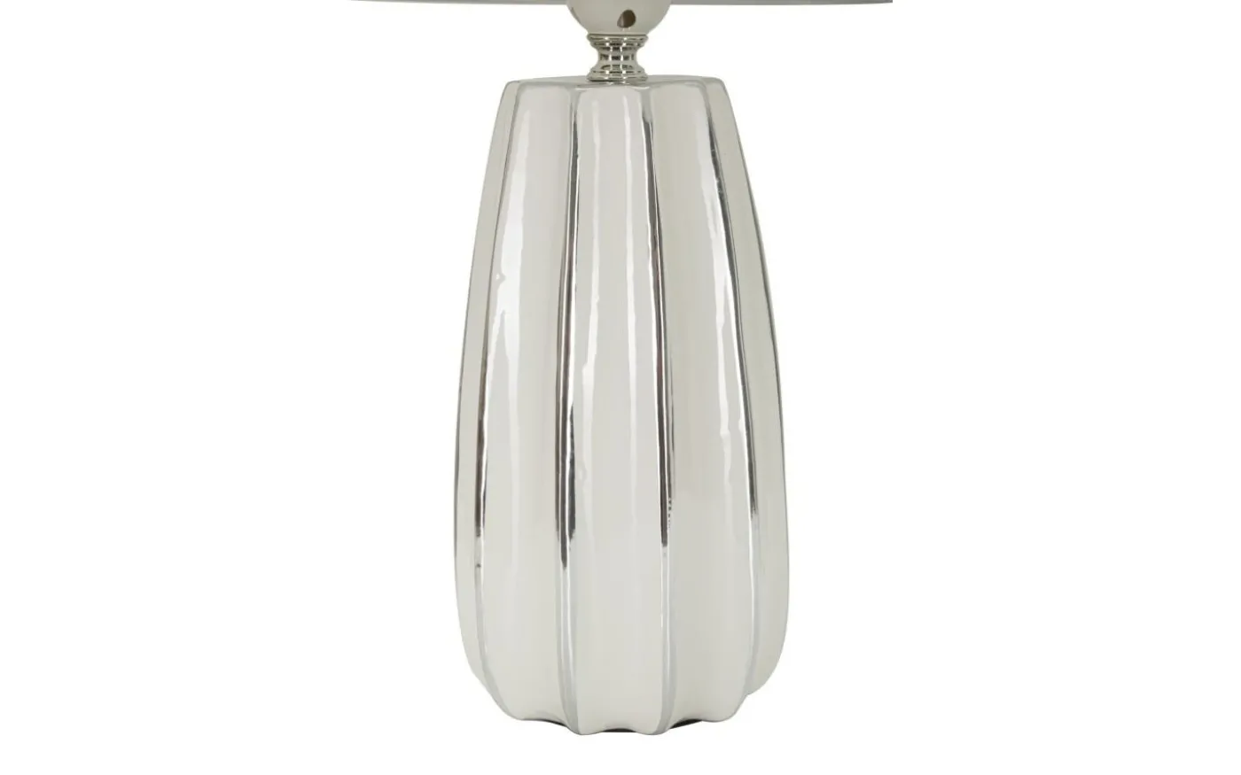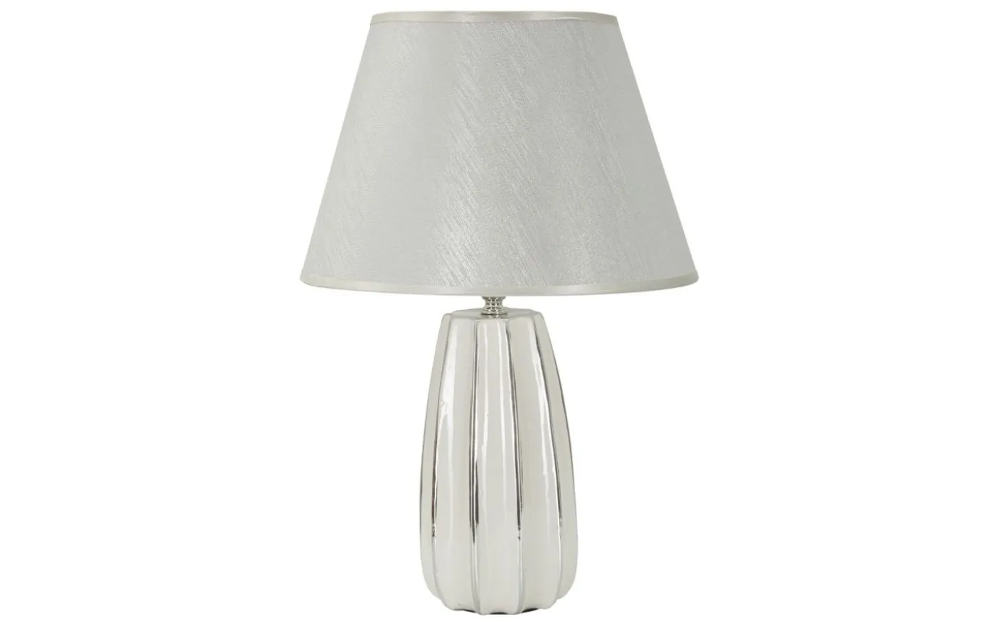 Bordslampa i vit och silverkeramik med mjuka och regelbundna linjer. Komplett med silvertyg lampskärm.