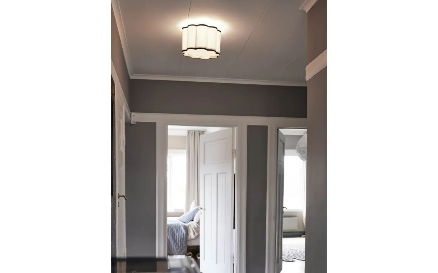Judy plafond från PR Home är en blomformad plafond av ekologisk bomull med svarta kantband som framhäver formen och gör den till ett blickfång.