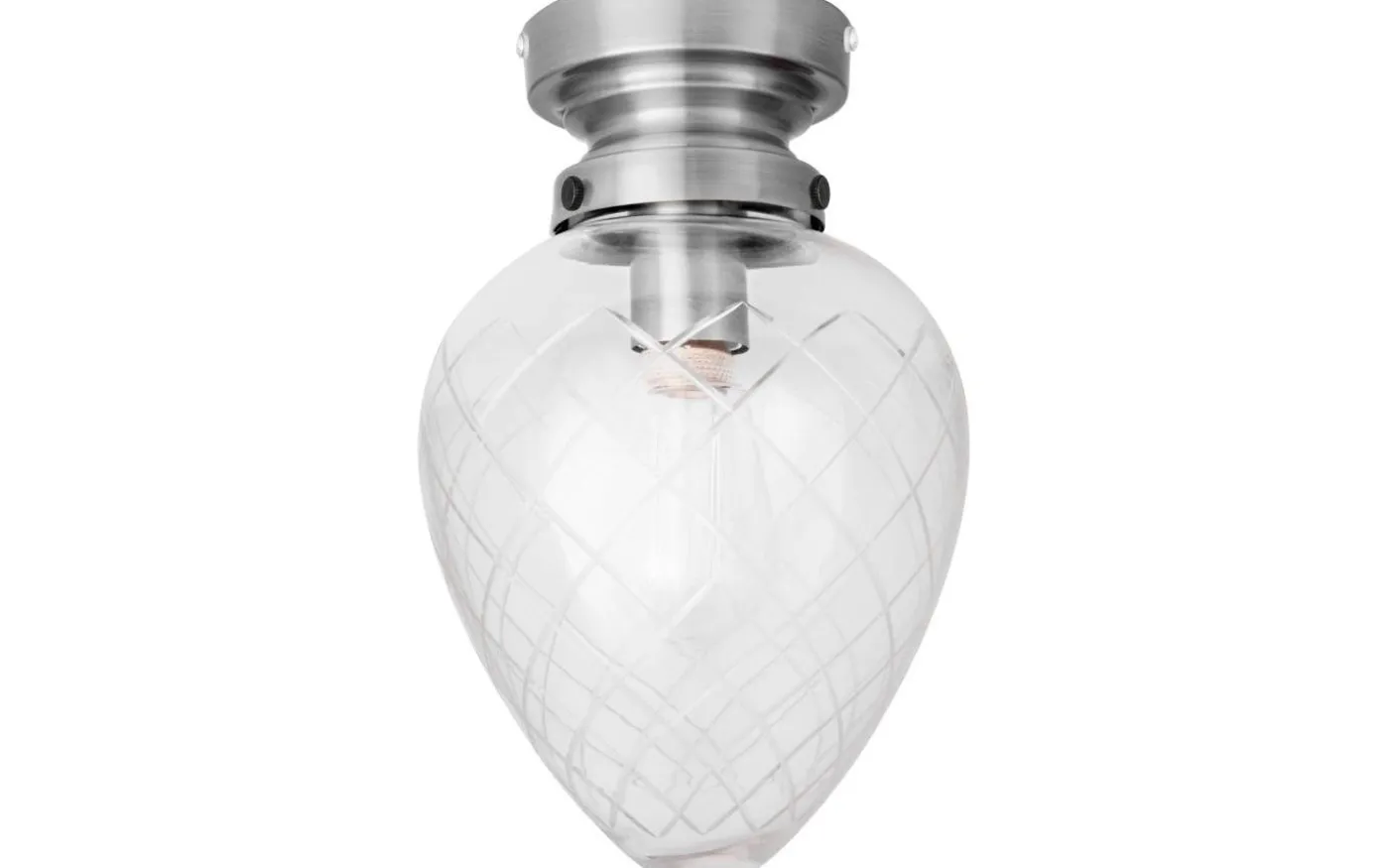 Juni från Globen Lighting är en plafond med stomme i stålfärgad metall och har en glaskupa som är dropformad och gjord i klarglas med vackert rutmönster.