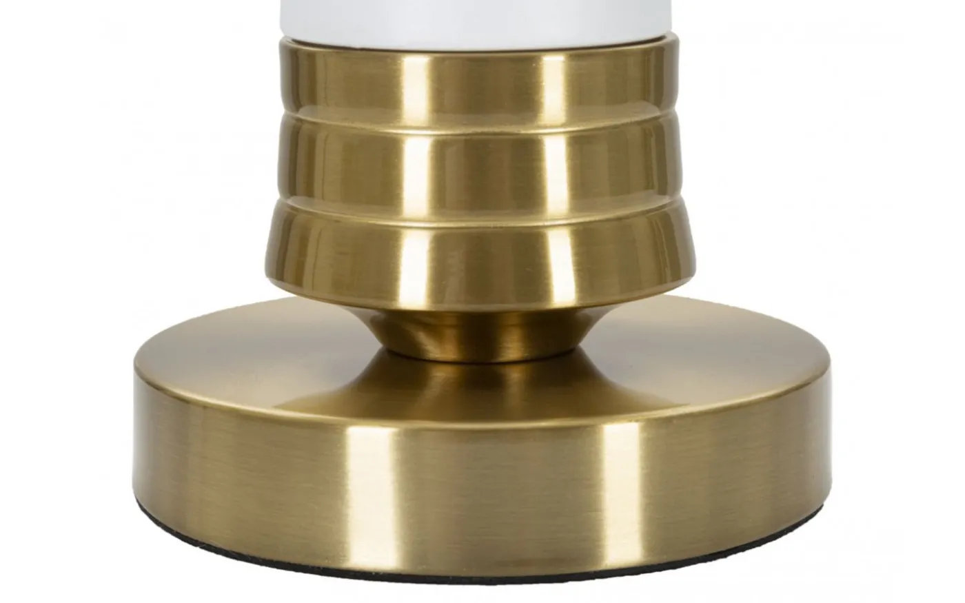 Bordslampa i gyllene metall med elegant vit dekoration och med rund fot. Komplett med vit tyglampskärm med guldkanter.