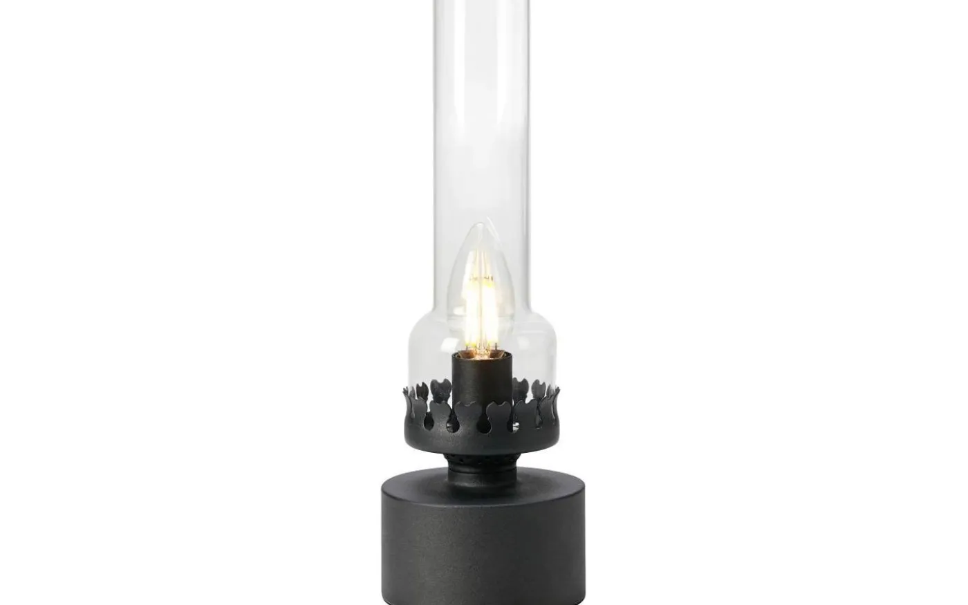 Klassisk bordslampa som påminner om en ljuslykta. Bas i mattsvart metall med pulverlackad finish och detaljerat mönster i kanten. Sprider ett stämningsfullt sken genom det klara glaset. Passar fint som stämningsbelysning i fönstret. Totalhöjd om 30,8 cm och diameter om 10,5 cm. Finns även i vitt.