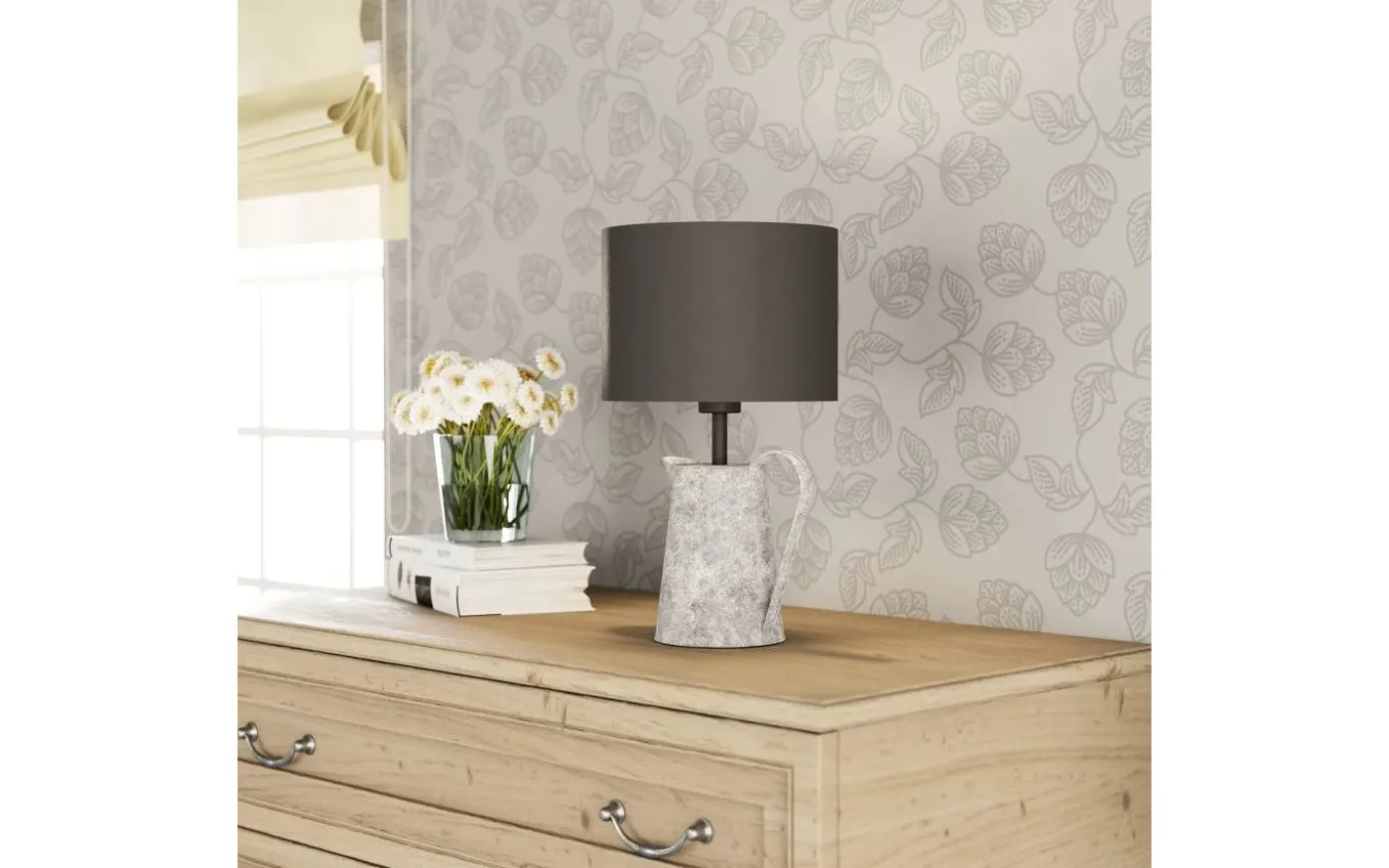 KENSAL bordslampa har en vattenkanna-inspirerad bas i grått och en svart tygskärm med svart insida. Bordslampan kan enkelt tändas och släckas med hjälp av sladdströmbrytaren. Den unika designen smälter samman med ett brett utbud av inredningsstilar och ger mysig belysning för alla utrymmen, oavsett om det är i sovrummet, vardagsrummet, matsalen eller hallen.