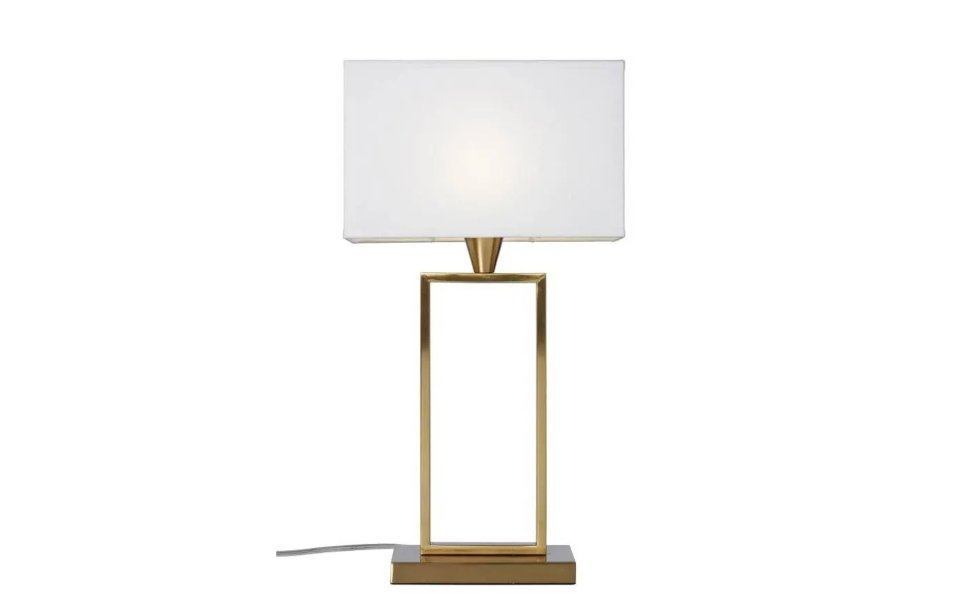 Stilrena bordslampan Kensington, från välkända Cottex, är en elegant bordslampa med fot i mässingsfärgad metall med en borstad finish kombinerat med en rektangulär skärm i vit textil.